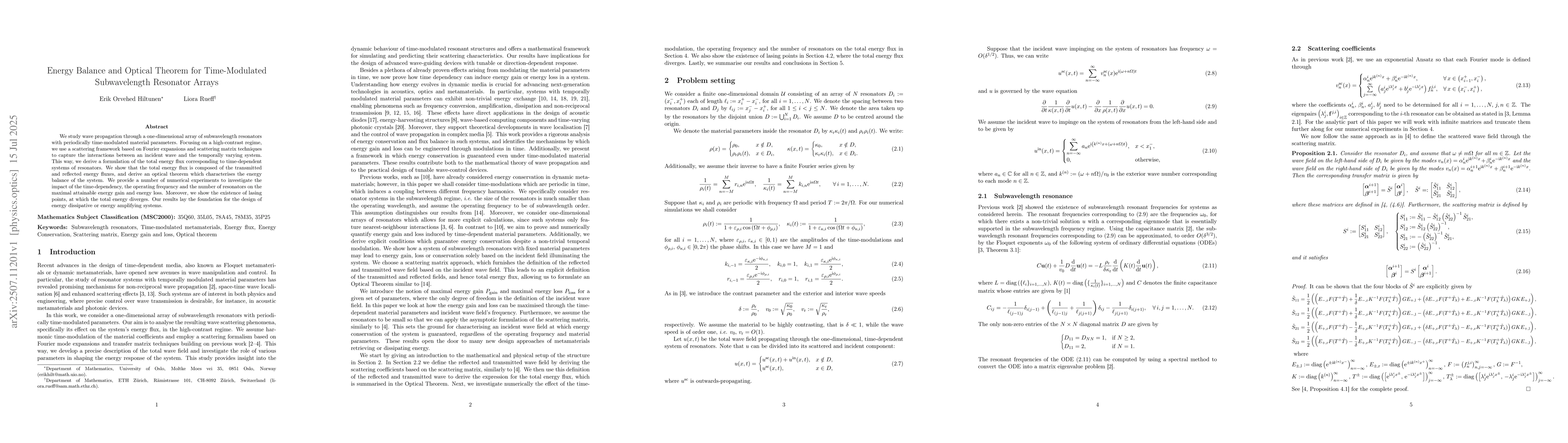 We study wave propagation through a one-dimensional array of subwavelength resonators with periodically time-modulated material parameters. Focusing on a high-contrast regime, we use a scattering framework based on Fourier expansions and scattering matrix techniques to capture the interactions between an incident wave and the temporally varying system. This way, we derive a formulation of the total energy flux corresponding to time-dependent systems of resonators. We show that the total energy flux is composed of the transmitted and reflected energy fluxes, and derive an optical theorem which characterises the energy balance of the system. We provide a number of numerical experiments to investigate the impact of the time-dependency, the operating frequency and the number of resonators on the maximal attainable energy gain and energy loss. Moreover, we show the existence of lasing points, at which the total energy diverges. Our results lay the foundation for the design of energy dissipative or energy amplifying systems.