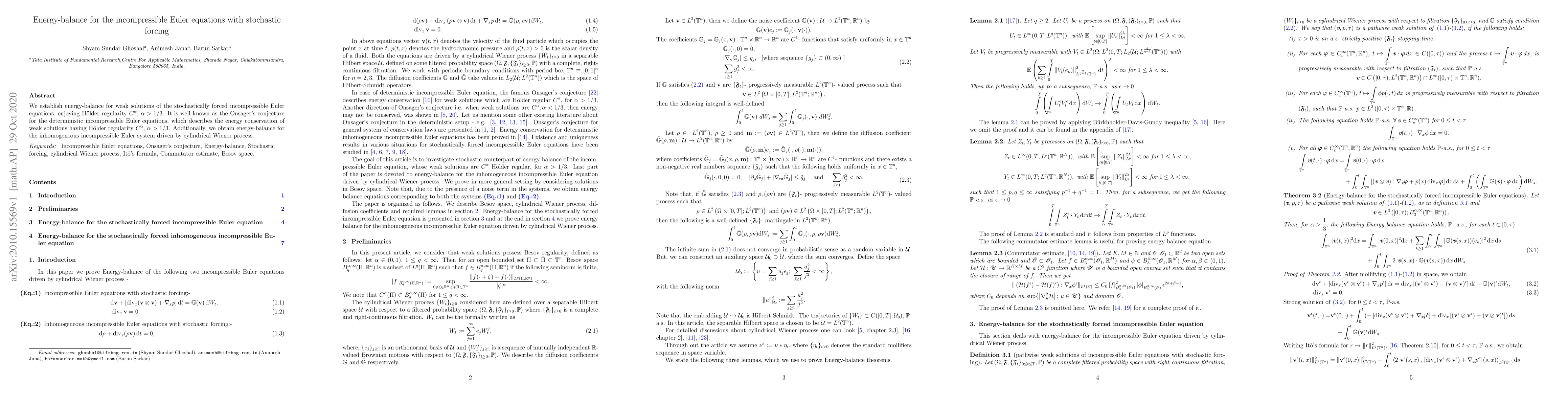 This paper establishes energy-balance for weak solutions of stochastically forced incompressible Euler equations with H\"older regularity $C^{\alpha}$, $\alpha>1/3$, confirming Onsager's conjecture. It also extends these results to the inhomogeneous system driven by a cylindrical Wiener process.