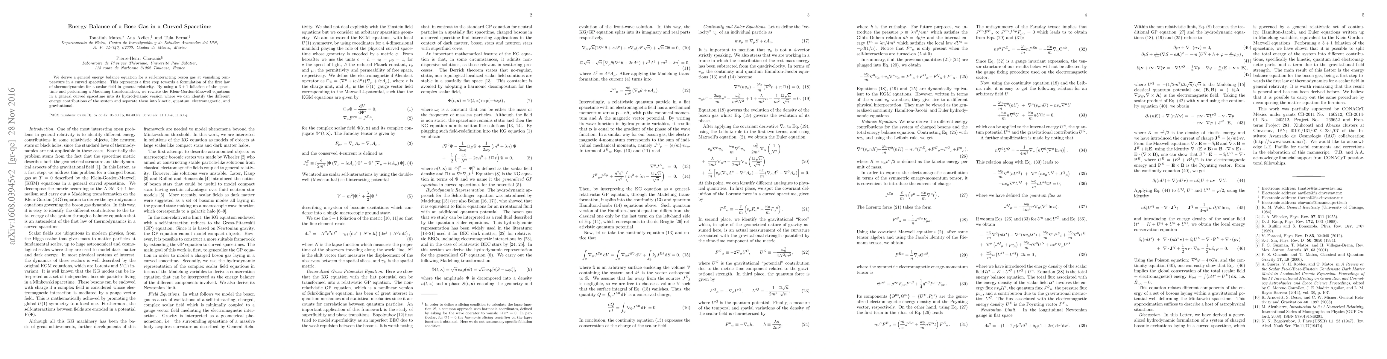 This paper derives an energy balance equation for a boson gas at zero temperature in curved spacetime, aiming to formulate the first law of thermodynamics for a scalar field in general relativity. The authors use a $3+1$ spacetime foliation and a Madelung transformation to express the Klein-Gordon-Maxwell equations in a hydrodynamic form, identifying kinetic, quantum, electromagnetic, and gravitational energy contributions.