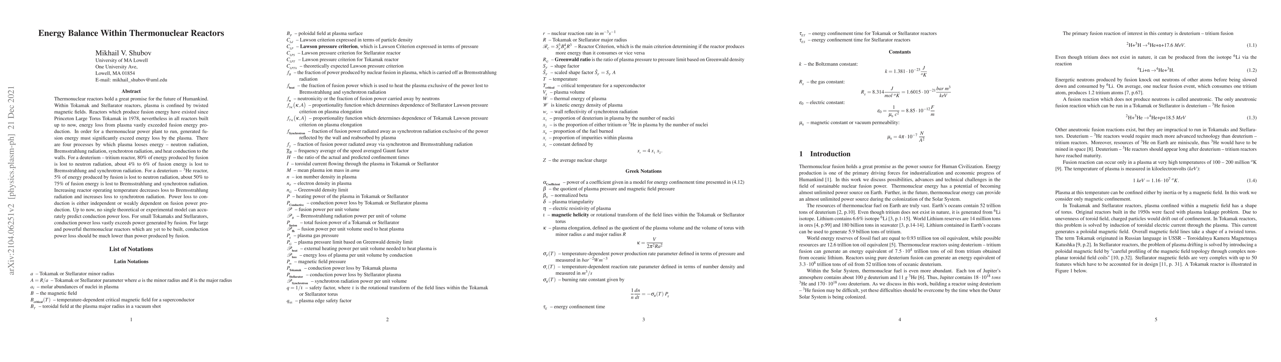 This paper discusses the energy balance challenges in thermonuclear reactors, particularly Tokamak and Stellarator designs, where plasma confinement and energy loss processes are critical. Despite decades of research, energy loss from plasma, primarily through neutron radiation, Bremsstrahlung, and synchrotron radiation, has significantly exceeded fusion energy production, hindering the development of practical fusion power plants.