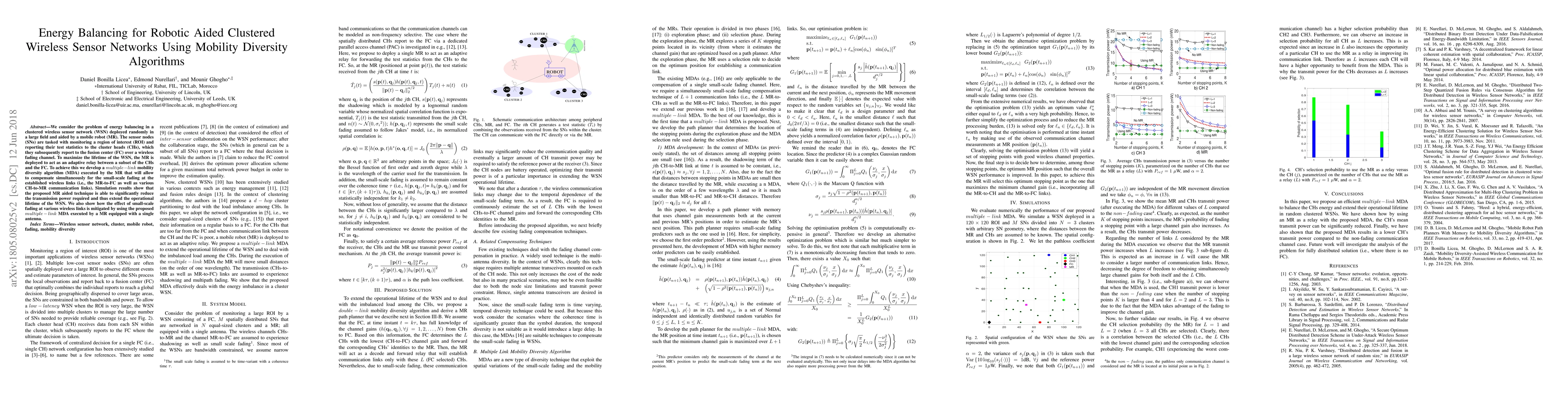 A robotic aided clustered wireless sensor network uses a mobility diversity algorithm to extend its operational lifetime by reducing transmission power requirements.