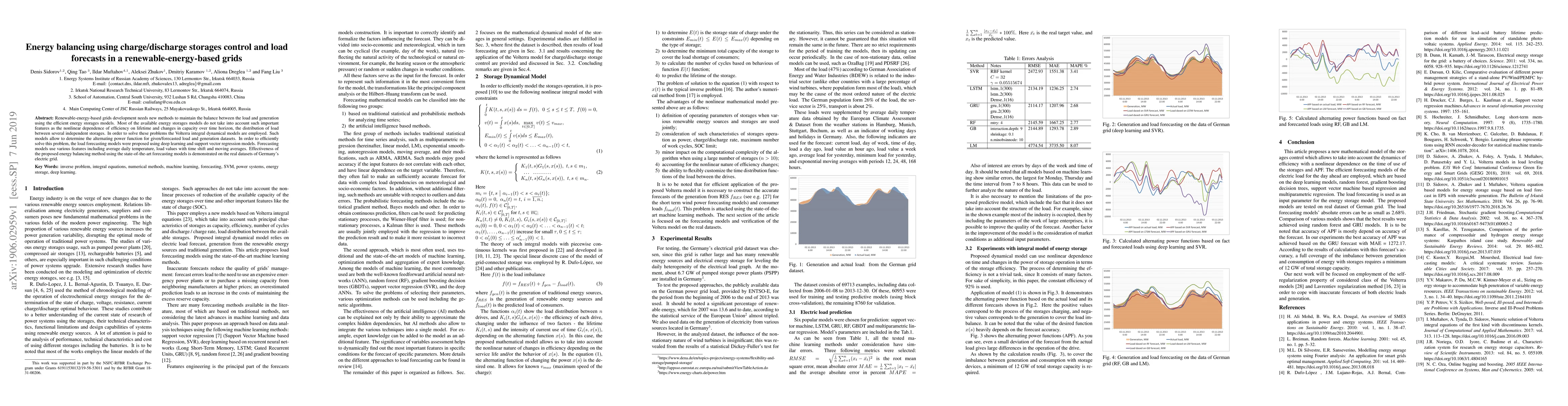 Renewable-energy-based grids development needs new methods to maintain the balance between the load and generation using the efficient energy storages models. Most of the available energy storages models do not take into account such important features as the nonlinear dependence of efficiency on lifetime and changes in capacity over time horizon, the distribution of load between several independent storages. In order to solve these problems the Volterra integral dynamical models are employed. Such models allow to determine the alternating power function for given/forecasted load and generation datasets. In order to efficiently solve this problem, the load forecasting models were proposed using deep learning and support vector regression models. Forecasting models use various features including average daily temperature, load values with time shift and moving averages. Effectiveness of the proposed energy balancing method using the state-of-the-art forecasting models is demonstrated on the real datasets of Germany's electric grid.