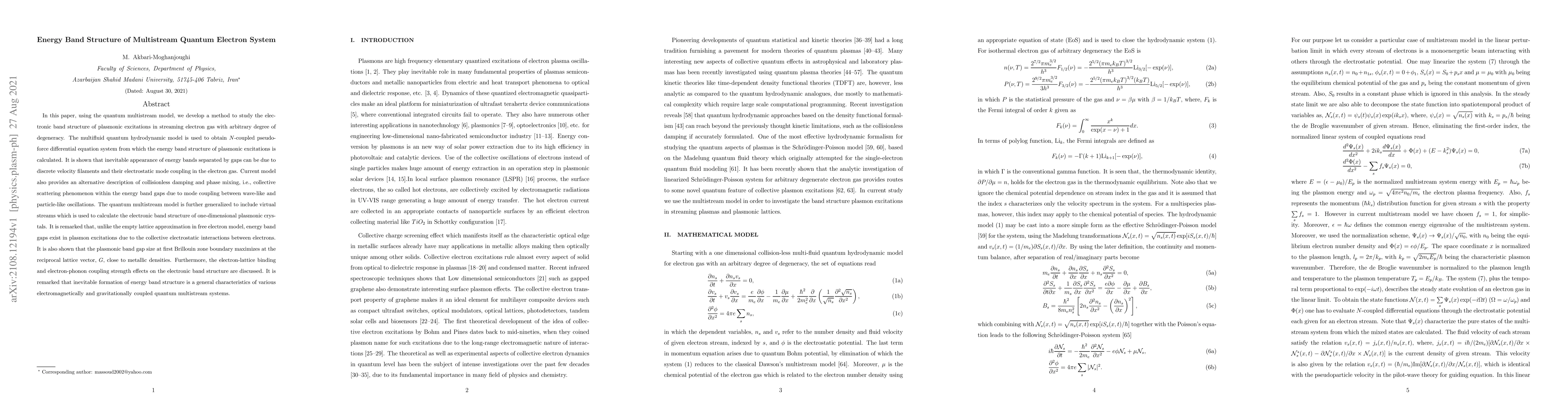 In this paper, using the quantum multistream model, we develop a method to study the electronic band structure of plasmonic excitations in streaming electron gas with arbitrary degree of degeneracy. The multifluid quantum hydrodynamic model is used to obtain $N$-coupled pseudoforce differential equation system from which the energy band structure of plasmonic excitations is calculated. It is shown that inevitable appearance of energy bands separated by gaps can be due to discrete velocity filaments and their electrostatic mode coupling in the electron gas. Current model also provides an alternative description of collisionless damping and phase mixing, i.e., collective scattering phenomenon within the energy band gaps due to mode coupling between wave-like and particle-like oscillations. The quantum multistream model is further generalized to include virtual streams which is used to calculate the electronic band structure of one-dimensional plasmonic crystals. It is remarked that, unlike the empty lattice approximation in free electron model, energy band gaps exist in plasmon excitations due to the collective electrostatic interactions between electrons. It is also shown that the plasmonic band gap size at first Brillouin zone boundary maximizes at the reciprocal lattice vector, $G$, close to metallic densities. Furthermore, the electron-lattice binding and electron-phonon coupling strength effects on the electronic band structure are discussed. It is remarked that inevitable formation of energy band structure is a general characteristics of various electromagnetically and gravitationally coupled quantum multistream systems.