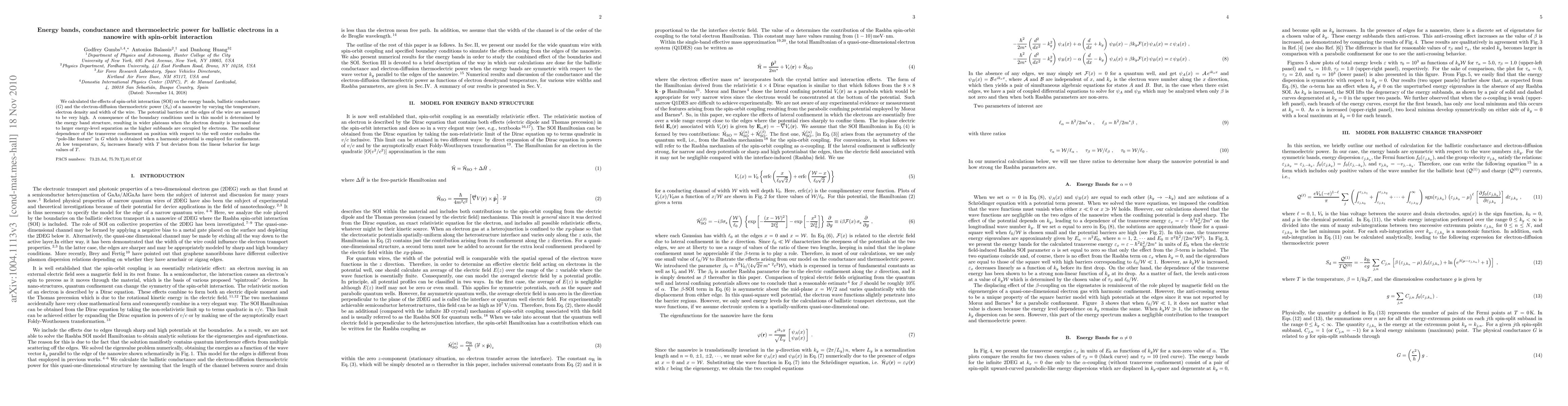 We calculated the effects of spin-orbit interaction (SOI) on the energy bands, ballistic conductance and the electron-diffusion thermoelectric power of a nanowire by varying the temperature, electron density and width of the wire. The potential barriers at the edges of the wire are assumed to be very high. A consequence of the boundary conditions used in this model is determined by the energy band structure, resulting in wider plateaus when the electron density is increased due to larger energy-level separation as the higher subbands are occupied by electrons. The nonlinear dependence of the transverse confinement on position with respect to the well center excludes the "pole-like feature" in the conductance which is obtained when a harmonic potential is employed for confinement. At low temperature, the electron diffusion thermoelectric power increases linearly with T but deviates from the linear behavior for large values of T.
