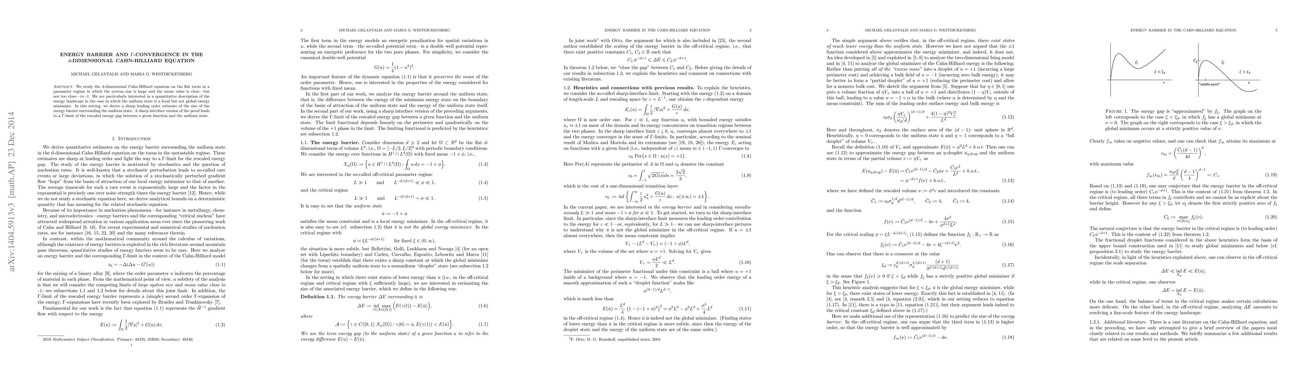 Researchers derived a sharp leading order estimate of the energy barrier size surrounding a uniform state in the d-dimensional Cahn-Hilliard equation, showing its convergence to a $ extit{Γ}$-limit under specific parameter regimes.