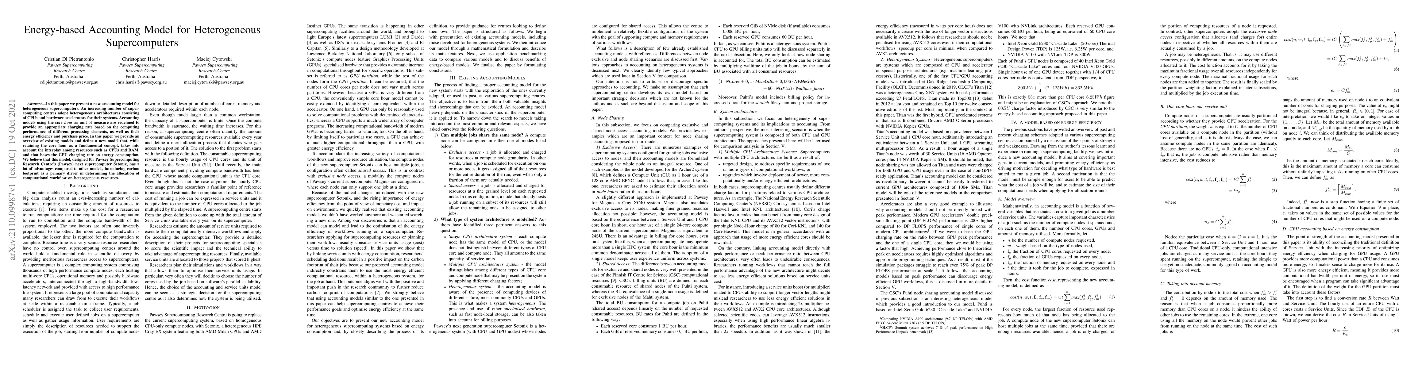 This paper proposes a novel energy-based accounting model for heterogeneous supercomputers, redefining core hour units to consider diverse processing element performance, energy efficiency, and purchase costs. The model, advantageous for centers like Pawsey Supercomputing Research Centre, prioritizes carbon footprint in resource allocation, offering a sustainable approach to workflow distribution across CPUs and GPUs.