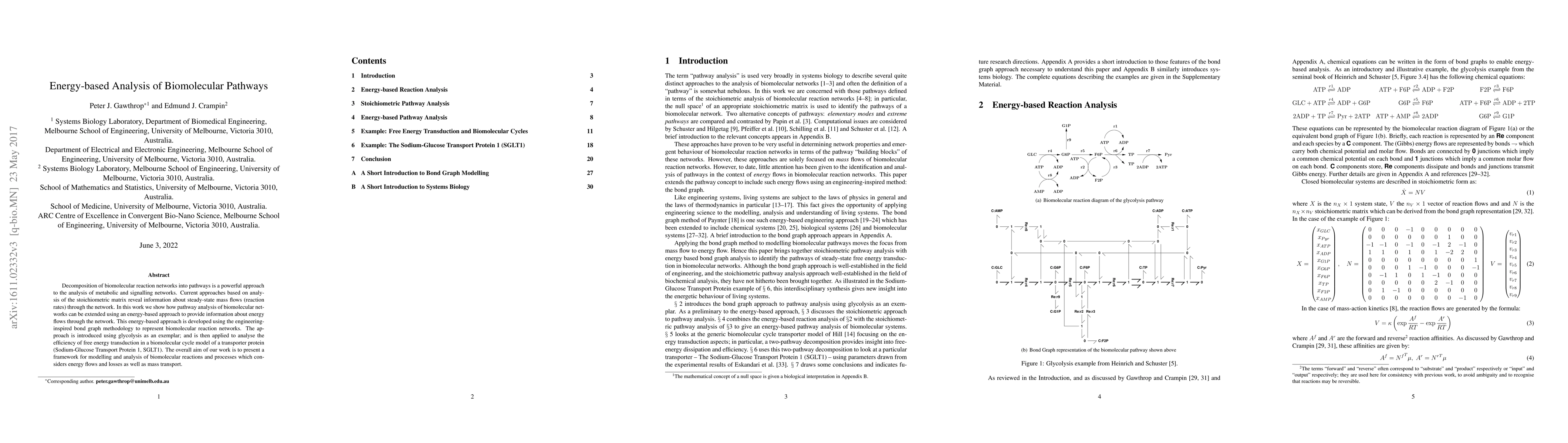 This paper develops an energy-based analysis framework for biomolecular pathways using bond graph methodology, extending traditional stoichiometric matrix analysis to include energy flows. It demonstrates the approach using glycolysis and the SGLT1 transporter protein to evaluate free energy transduction efficiency.