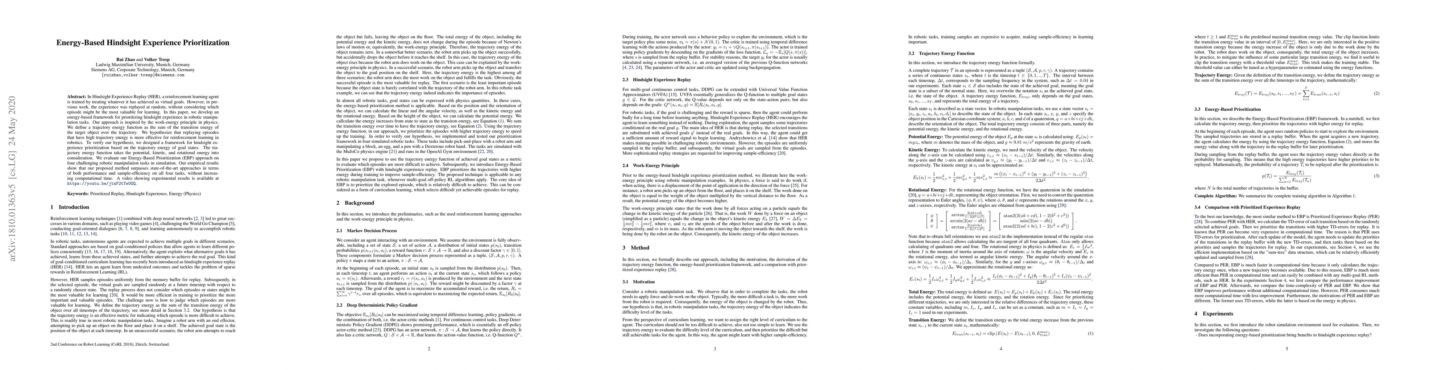 This paper proposes an Energy-Based Prioritization (EBP) framework for Hindsight Experience Replay in reinforcement learning, aiming to improve sample efficiency by prioritizing episodes with higher trajectory energy. Empirical results on four robotic manipulation tasks demonstrate superior performance compared to state-of-the-art methods without additional computational cost.