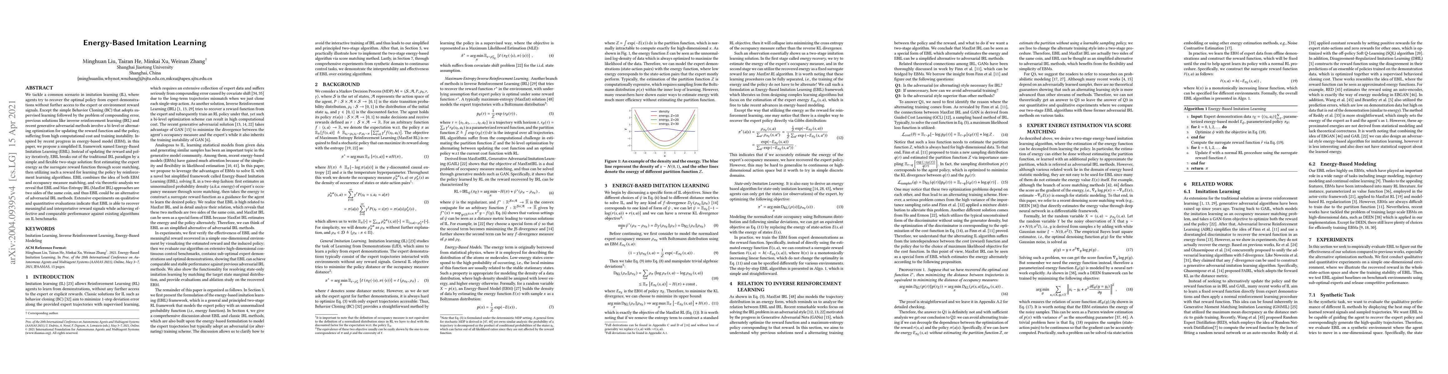 We tackle a common scenario in imitation learning (IL), where agents try to recover the optimal policy from expert demonstrations without further access to the expert or environment reward signals. Except the simple Behavior Cloning (BC) that adopts supervised learning followed by the problem of compounding error, previous solutions like inverse reinforcement learning (IRL) and recent generative adversarial methods involve a bi-level or alternating optimization for updating the reward function and the policy, suffering from high computational cost and training instability. Inspired by recent progress in energy-based model (EBM), in this paper, we propose a simplified IL framework named Energy-Based Imitation Learning (EBIL). Instead of updating the reward and policy iteratively, EBIL breaks out of the traditional IRL paradigm by a simple and flexible two-stage solution: first estimating the expert energy as the surrogate reward function through score matching, then utilizing such a reward for learning the policy by reinforcement learning algorithms. EBIL combines the idea of both EBM and occupancy measure matching, and via theoretic analysis we reveal that EBIL and Max-Entropy IRL (MaxEnt IRL) approaches are two sides of the same coin, and thus EBIL could be an alternative of adversarial IRL methods. Extensive experiments on qualitative and quantitative evaluations indicate that EBIL is able to recover meaningful and interpretative reward signals while achieving effective and comparable performance against existing algorithms on IL benchmarks.