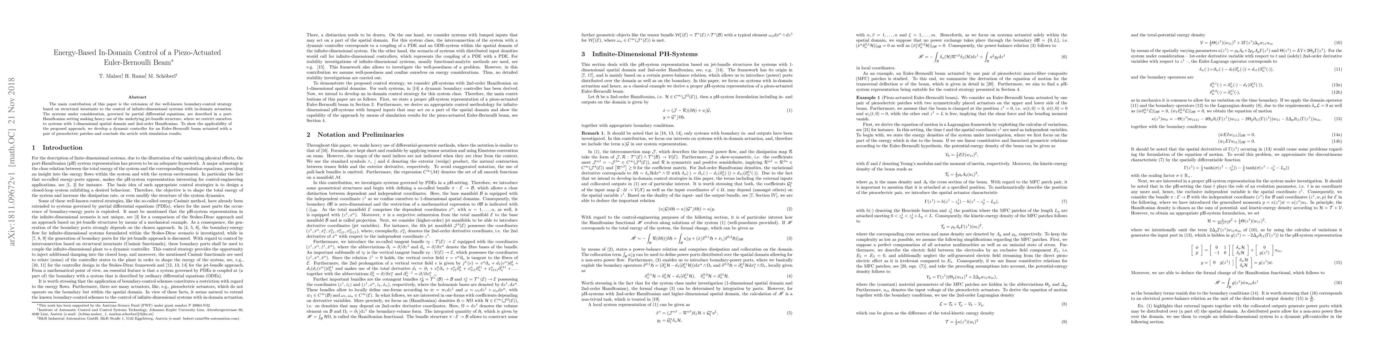 This paper extends boundary-control strategies to in-domain piezo-actuated Euler-Bernoulli beams, employing a port-Hamiltonian framework and jet-bundle structure. The proposed dynamic controller is demonstrated through simulation results for a beam with piezoelectric patches.