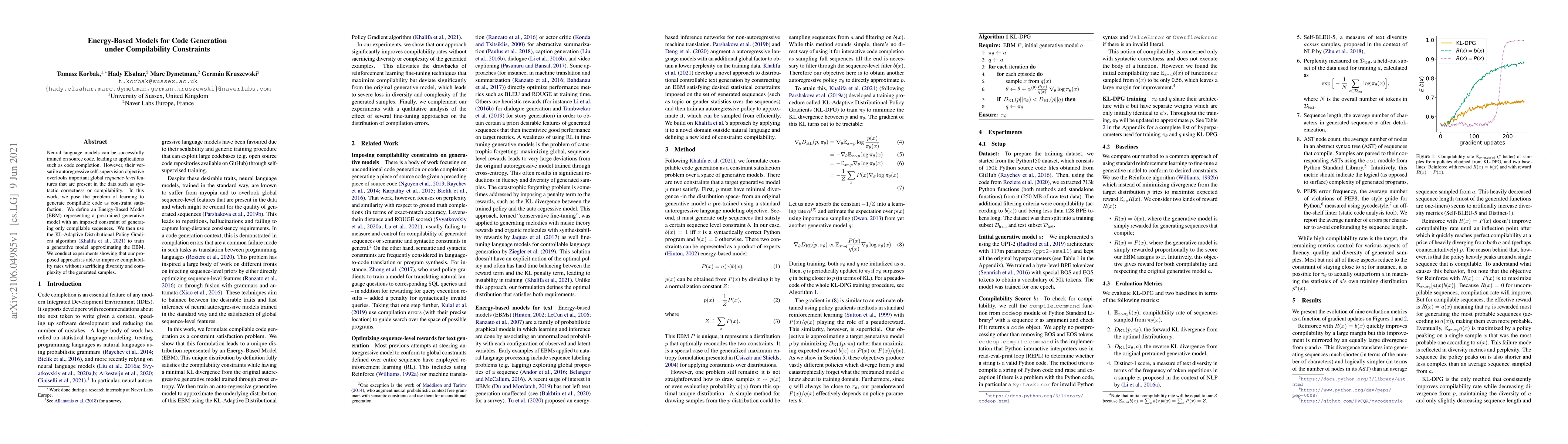 This paper proposes an Energy-Based Model (EBM) to generate compilable code by imposing constraints on neural language models, trained with the KL-Adaptive Distributional Policy Gradient algorithm. The results demonstrate improved compilability rates while maintaining code diversity and complexity.