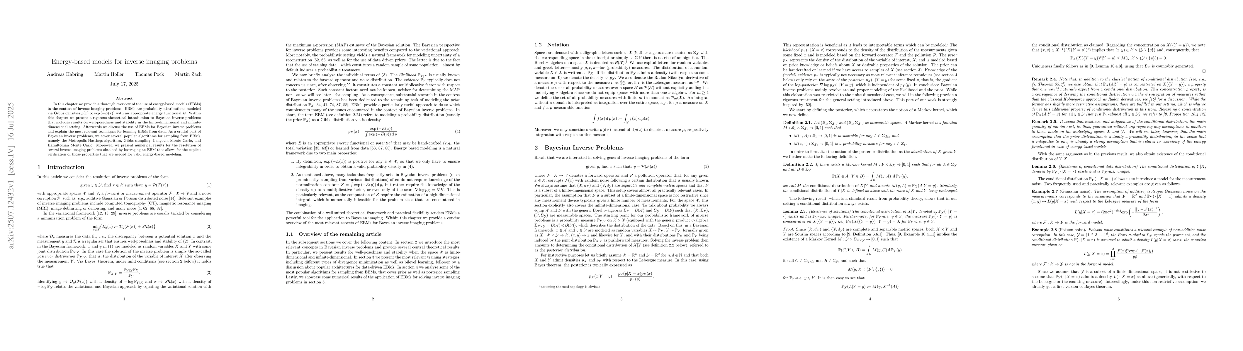 In this chapter we provide a thorough overview of the use of energy-based models (EBMs) in the context of inverse imaging problems. EBMs are probability distributions modeled via Gibbs densities $p(x) \propto \exp{-E(x)}$ with an appropriate energy functional $E$. Within this chapter we present a rigorous theoretical introduction to Bayesian inverse problems that includes results on well-posedness and stability in the finite-dimensional and infinite-dimensional setting. Afterwards we discuss the use of EBMs for Bayesian inverse problems and explain the most relevant techniques for learning EBMs from data. As a crucial part of Bayesian inverse problems, we cover several popular algorithms for sampling from EBMs, namely the Metropolis-Hastings algorithm, Gibbs sampling, Langevin Monte Carlo, and Hamiltonian Monte Carlo. Moreover, we present numerical results for the resolution of several inverse imaging problems obtained by leveraging an EBM that allows for the explicit verification of those properties that are needed for valid energy-based modeling.