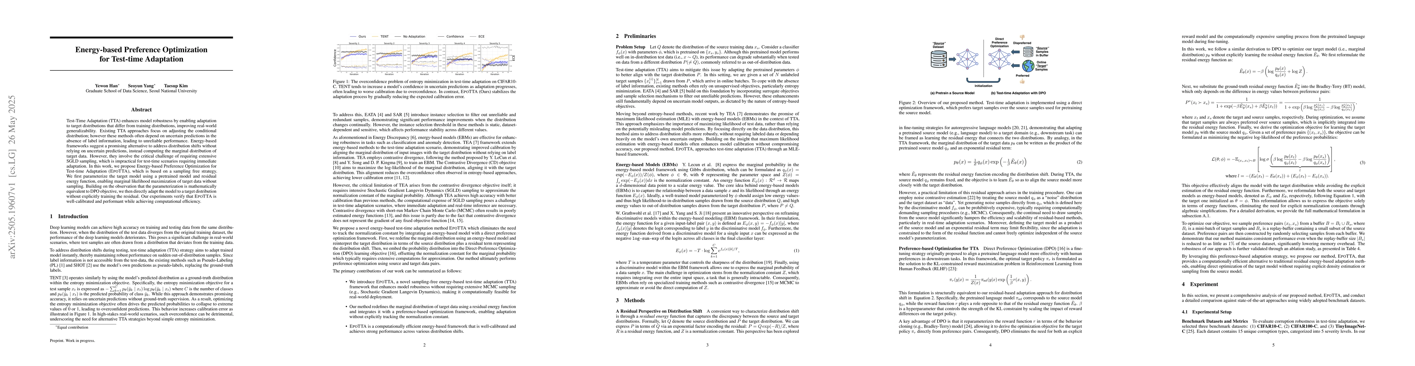 Test-Time Adaptation (TTA) enhances model robustness by enabling adaptation to target distributions that differ from training distributions, improving real-world generalizability. Existing TTA approaches focus on adjusting the conditional distribution; however these methods often depend on uncertain predictions in the absence of label information, leading to unreliable performance. Energy-based frameworks suggest a promising alternative to address distribution shifts without relying on uncertain predictions, instead computing the marginal distribution of target data. However, they involve the critical challenge of requiring extensive SGLD sampling, which is impractical for test-time scenarios requiring immediate adaptation. In this work, we propose Energy-based Preference Optimization for Test-time Adaptation (EPOTTA), which is based on a sampling free strategy. We first parameterize the target model using a pretrained model and residual energy function, enabling marginal likelihood maximization of target data without sampling. Building on the observation that the parameterization is mathematically equivalent to DPO objective, we then directly adapt the model to a target distribution without explicitly training the residual. Our experiments verify that EPOTTA is well-calibrated and performant while achieving computational efficiency.