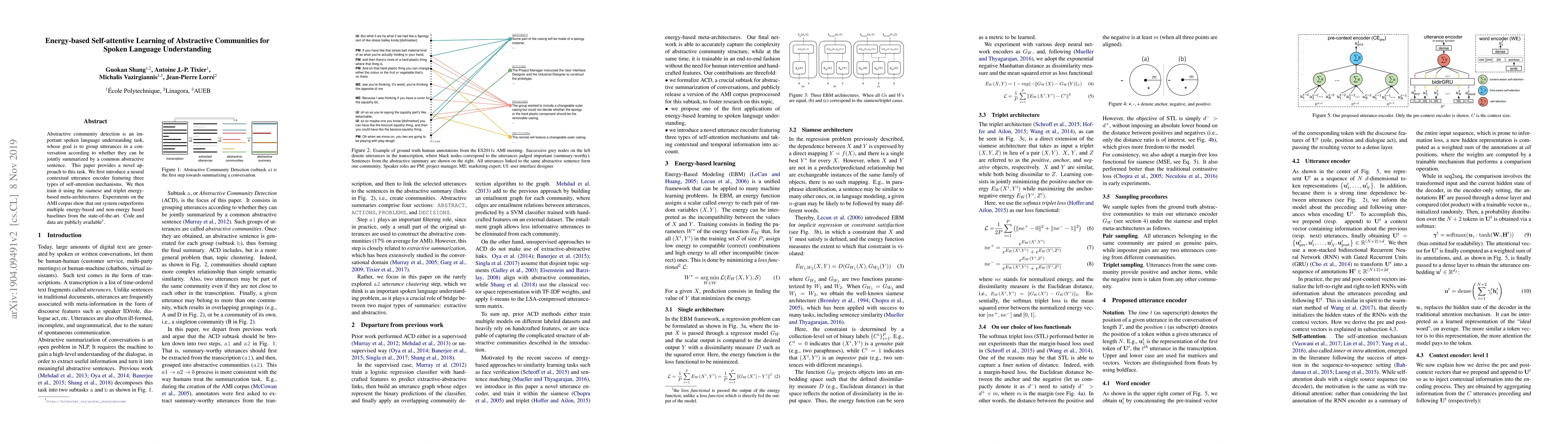 Abstractive community detection is an important spoken language understanding task, whose goal is to group utterances in a conversation according to whether they can be jointly summarized by a common abstractive sentence. This paper provides a novel approach to this task. We first introduce a neural contextual utterance encoder featuring three types of self-attention mechanisms. We then train it using the siamese and triplet energy-based meta-architectures. Experiments on the AMI corpus show that our system outperforms multiple energy-based and non-energy based baselines from the state-of-the-art. Code and data are publicly available.