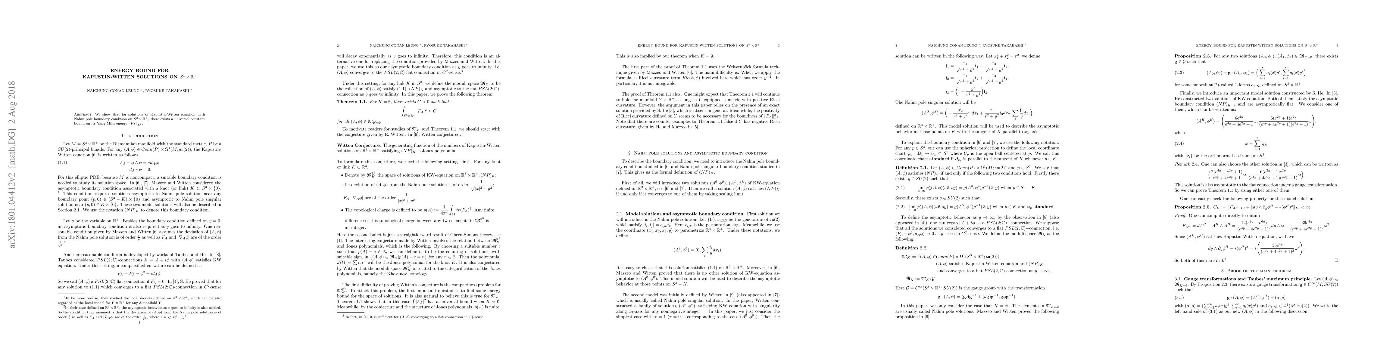 This research proves the existence of an energy bound for Nahm pole solutions of the Kapustin-Witten equation on $S^3\times\mathbb{R}^+$, demonstrating that the $L^2$ norm of the curvature $F_A$ is bounded by a constant $C>0$ for any such solution $(A,\phi)$.