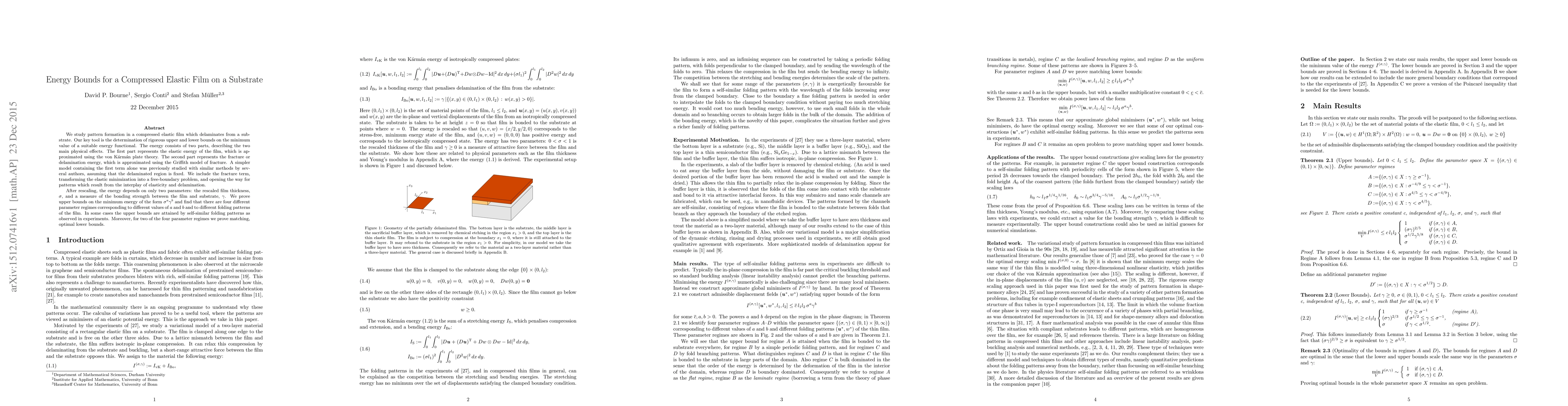 We study pattern formation in a compressed elastic film which delaminates from a substrate. Our key tool is the determination of rigorous upper and lower bounds on the minimum value of a suitable energy functional. The energy consists of two parts, describing the two main physical effects. The first part represents the elastic energy of the film, which is approximated using the von K\'arm\'an plate theory. The second part represents the fracture or delamination energy, which is approximated using the Griffith model of fracture. A simpler model containing the first term alone was previously studied with similar methods by several authors, assuming that the delaminated region is fixed. We include the fracture term, transforming the elastic minimization into a free-boundary problem, and opening the way for patterns which result from the interplay of elasticity and delamination. After rescaling, the energy depends on only two parameters: the rescaled film thickness, $\sigma$, and a measure of the bonding strength between the film and substrate, $\gamma$. We prove upper bounds on the minimum energy of the form $\sigma^a \gamma^b$ and find that there are four different parameter regimes corresponding to different values of $a$ and $b$ and to different folding patterns of the film. In some cases the upper bounds are attained by self-similar folding patterns as observed in experiments. Moreover, for two of the four parameter regimes we prove matching, optimal lower bounds.