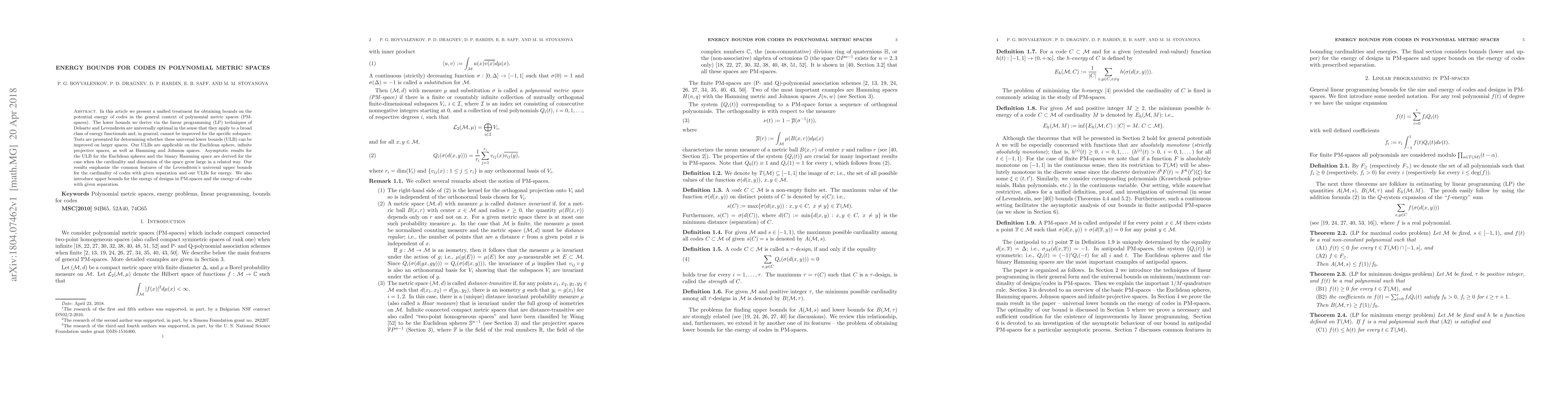 This paper presents universally optimal lower bounds for the potential energy of codes in polynomial metric spaces using linear programming techniques. It also introduces upper bounds for energy in these spaces, emphasizing the commonality with Levenshtein's universal upper bounds for code cardinality.