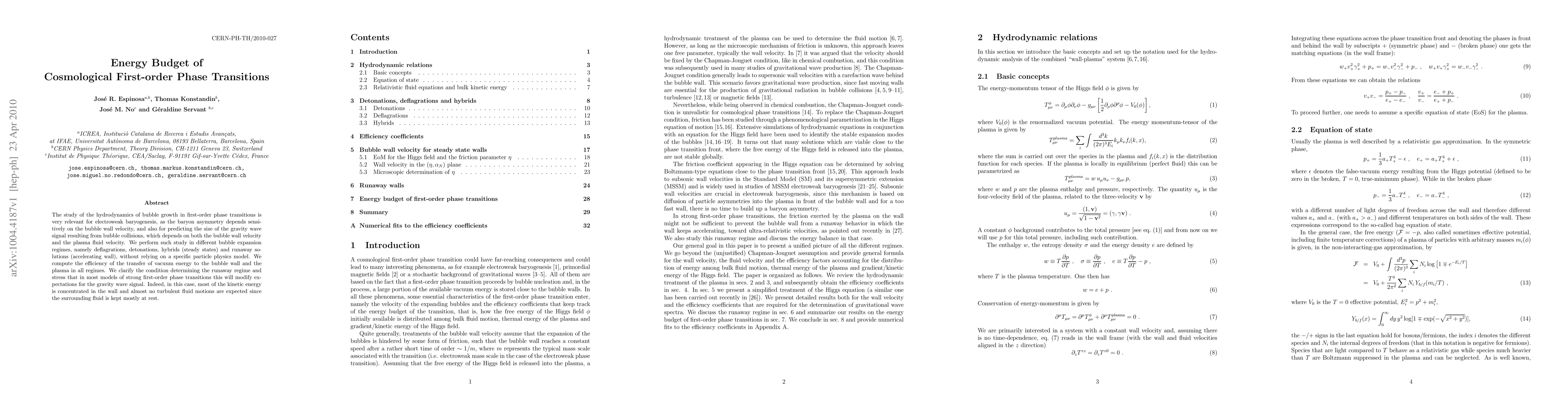 The study of the hydrodynamics of bubble growth in first-order phase transitions is very relevant for electroweak baryogenesis, as the baryon asymmetry depends sensitively on the bubble wall velocity, and also for predicting the size of the gravity wave signal resulting from bubble collisions, which depends on both the bubble wall velocity and the plasma fluid velocity. We perform such study in different bubble expansion regimes, namely deflagrations, detonations, hybrids (steady states) and runaway solutions (accelerating wall), without relying on a specific particle physics model. We compute the efficiency of the transfer of vacuum energy to the bubble wall and the plasma in all regimes. We clarify the condition determining the runaway regime and stress that in most models of strong first-order phase transitions this will modify expectations for the gravity wave signal. Indeed, in this case, most of the kinetic energy is concentrated in the wall and almost no turbulent fluid motions are expected since the surrounding fluid is kept mostly at rest.
