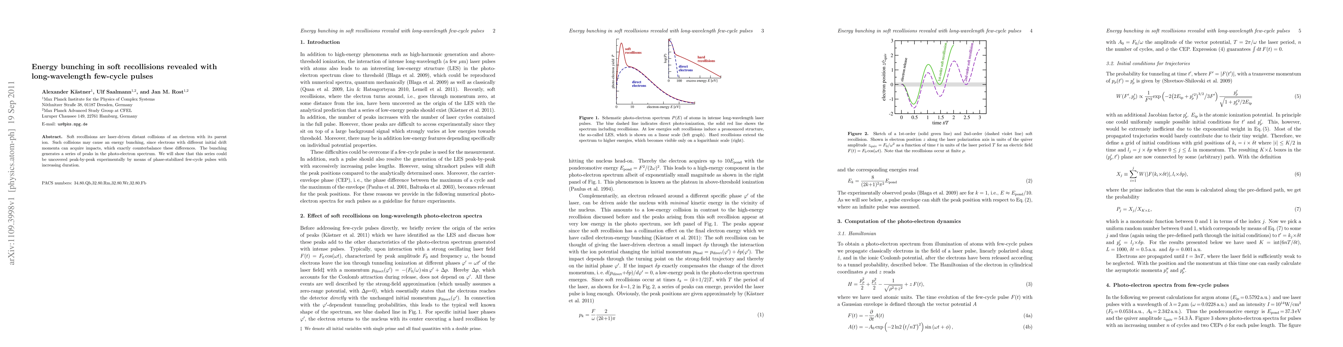This study reveals energy bunching in soft recollisions using long-wavelength few-cycle pulses, demonstrating how electrons with varying initial drift momenta can achieve recollisions that counterbalance their differences, generating observable peaks in the photo-electron spectrum. The technique employs phase-stabilized few-cycle pulses of increasing duration to experimentally uncover these peaks.