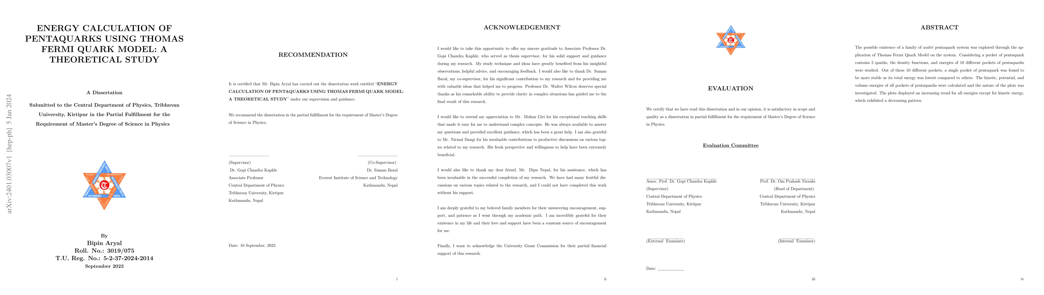 This study uses the Thomas Fermi Quark Model to explore the energy calculations of a $uudc\overline{c}$ pentaquark system, finding that one of ten examined configurations is the most stable. The research reveals an increasing trend in potential, volume, and total energies, while kinetic energy decreases.