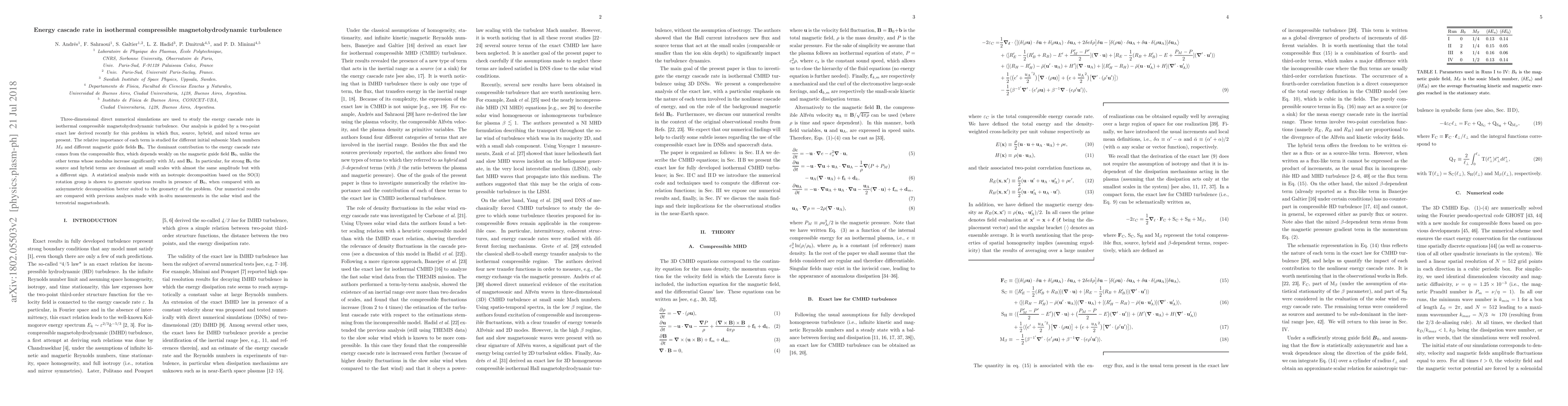 Three-dimensional direct numerical simulations are used to study the energy cascade rate in isothermal compressible magnetohydrodynamic turbulence. Our analysis is guided by a two-point exact law derived recently for this problem in which flux, source, hybrid, and mixed terms are present. The relative importance of each term is studied for different initial subsonic Mach numbers $M_S$ and different magnetic guide fields ${\bf B}_0$. The dominant contribution to the energy cascade rate comes from the compressible flux, which depends weakly on the magnetic guide field ${\bf B}_0$, unlike the other terms whose modulus increase significantly with $M_S$ and ${\bf B}_0$. In particular, for strong ${\bf B}_0$ the source and hybrid terms are dominant at small scales with almost the same amplitude but with a different sign. A statistical analysis made with an isotropic decomposition based on the SO(3) rotation group is shown to generate spurious results in presence of ${\bf B}_0$, when compared with an axisymmetric decomposition better suited to the geometry of the problem. Our numerical results are compared with previous analyses made with in-situ measurements in the solar wind and the terrestrial magnetosheath.