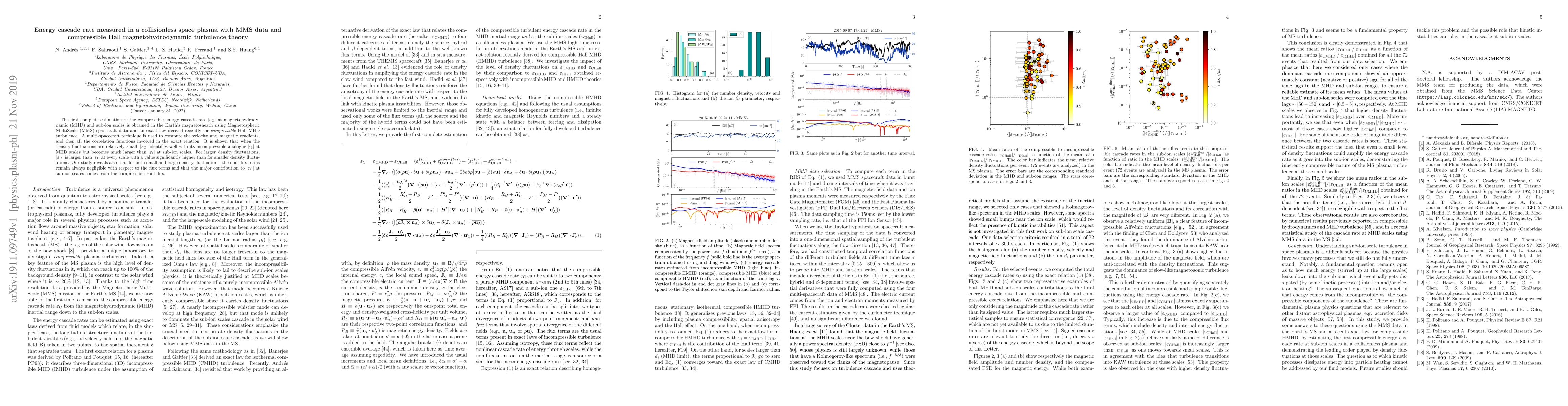 The first complete estimation of the compressible energy cascade rate $|\varepsilon_\text{C}|$ at magnetohydrodynamic (MHD) and sub-ion scales is obtained in the Earth's magnetosheath using Magnetospheric MultiScale (MMS) spacecraft data and an exact law derived recently for {\it compressible} Hall MHD turbulence. A multi-spacecraft technique is used to compute the velocity and magnetic gradients, and then all the correlation functions involved in the exact relation. It is shown that when the density fluctuations are relatively small, $|\varepsilon_\text{C}|$ identifies well with its incompressible analogue $|\varepsilon_\text{I}|$ at MHD scales but becomes much larger than $|\varepsilon_\text{I}|$ at sub-ion scales. For larger density fluctuations, $|\varepsilon_\text{C}|$ is larger than $|\varepsilon_\text{I}|$ at every scale with a value significantly higher than for smaller density fluctuations. Our study reveals also that for both small and large density fluctuations, the non-flux terms remain always negligible with respect to the flux terms and that the major contribution to $|\varepsilon_\text{C}|$ at sub-ion scales comes from the compressible Hall flux.