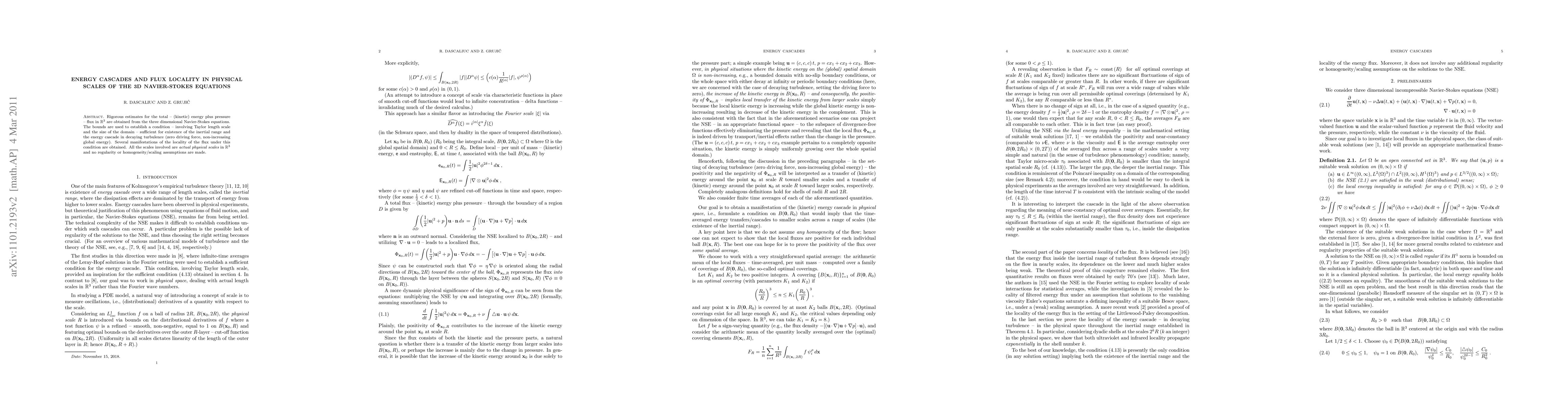 This paper provides rigorous estimates for energy and flux in the 3D Navier-Stokes equations, establishing conditions for the existence of an inertial range and energy cascade in decaying turbulence. It also demonstrates the locality of flux under these conditions, using physical scales without requiring regularity or homogeneity assumptions.
