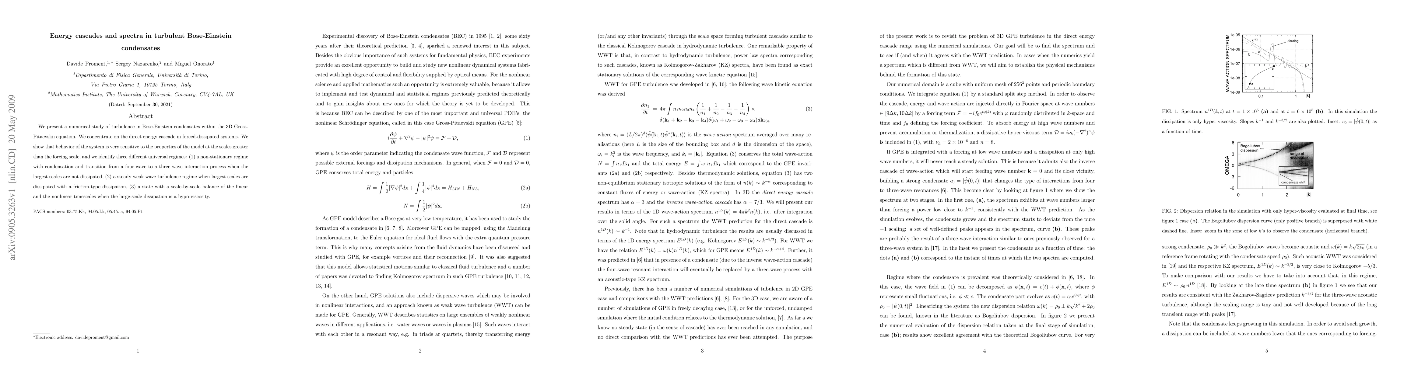 We present a numerical study of turbulence in Bose-Einstein condensates within the 3D Gross-Pitaevskii equation. We concentrate on the direct energy cascade in forced-dissipated systems. We show that behavior of the system is very sensitive to the properties of the model at the scales greater than the forcing scale, and we identify three different universal regimes: (1) a non-stationary regime with condensation and transition from a four-wave to a three-wave interaction process when the largest scales are not dissipated, (2) a steady weak wave turbulence regime when largest scales are dissipated with a friction-type dissipation, (3) a state with a scale-by-scale balance of the linear and the nonlinear timescales when the large-scale dissipation is a hypo-viscosity.