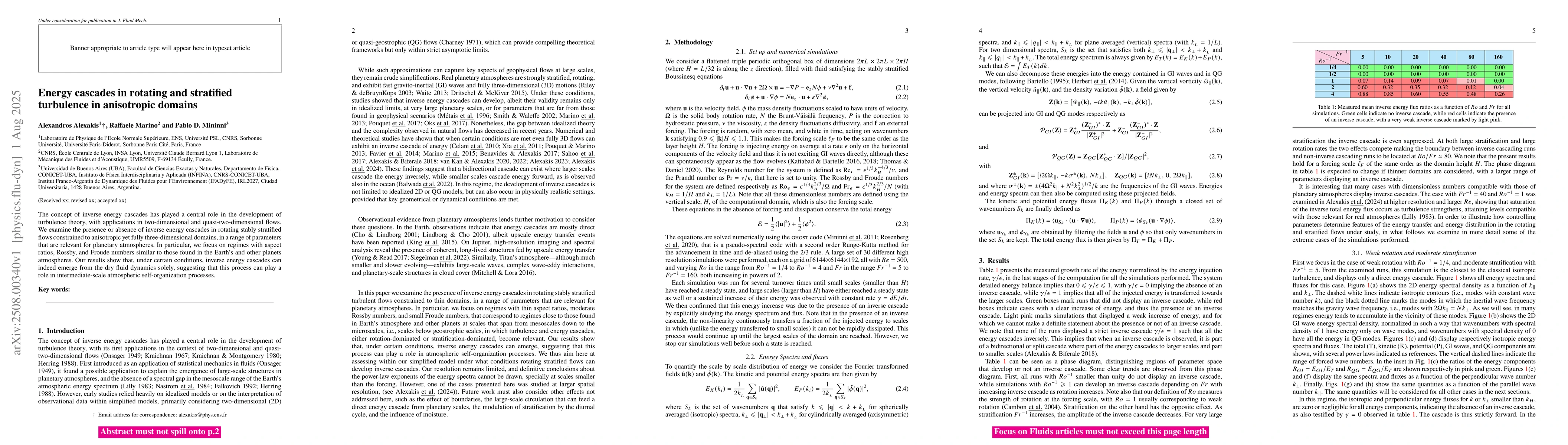 The concept of inverse energy cascades has played a central role in the development of turbulence theory, with applications in two-dimensional and quasi-two-dimensional flows. We examine the presence or absence of inverse energy cascades in rotating stably stratified flows constrained to anisotropic yet fully three-dimensional domains, in a range of parameters that are relevant for planetary atmospheres. In particular, we focus on regimes with aspect ratios, Rossby, and Froude numbers similar to those found in the Earth's and other planets atmospheres. Our results show that, under certain conditions, inverse energy cascades can indeed emerge from the dry fluid dynamics solely, suggesting that this process can play a role in intermediate-scale atmospheric self-organization processes.