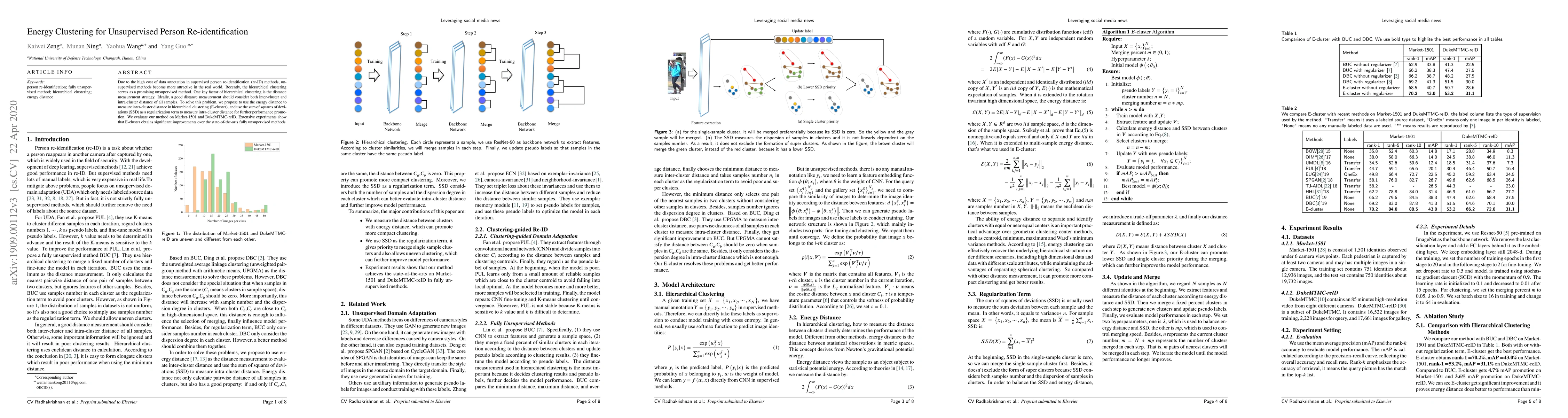 This paper proposes an energy clustering method (E-cluster) for unsupervised person re-identification, using energy distance to evaluate both inter-cluster and intra-cluster distances, and incorporating a sum of squares of deviations regularization term to balance diversity and similarity. The method outperforms state-of-the-art unsupervised and some transfer learning methods on large-scale datasets.
