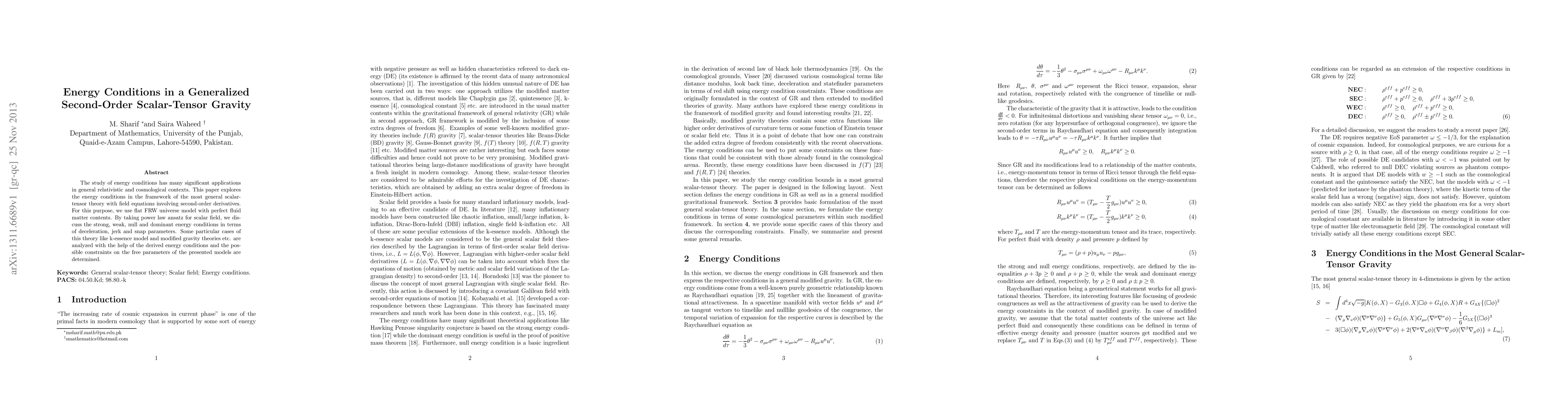 The study of energy conditions has many significant applications in general relativistic and cosmological contexts. This paper explores the energy conditions in the framework of the most general scalar-tensor theory with field equations involving second-order derivatives. For this purpose, we use flat FRW universe model with perfect fluid matter contents. By taking power law ansatz for scalar field, we discuss the strong, weak, null and dominant energy conditions in terms of deceleration, jerk and snap parameters. Some particular cases of this theory like k-essence model and modified gravity theories etc. are analyzed with the help of the derived energy conditions and the possible constraints on the free parameters of the presented models are determined.