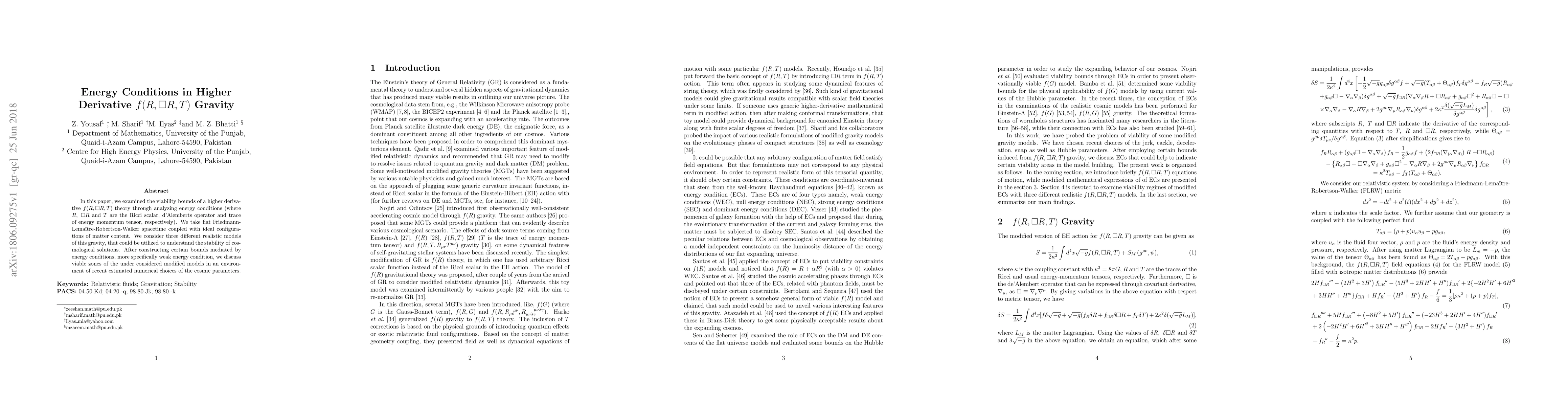 In this paper, we examined the viability bounds of a higher derivative $f(R,\Box R, T)$ theory through analyzing energy conditions (where $R$ and $T$ are the Ricci scalar and trace of energy momentum tensor, respectively). We take flat Friedmann-Lema\^{i}tre-Robertson-Walker spacetime coupled with ideal configurations of matter content. We consider three different realistic models of this gravity, that could be utilized to understand the stability of cosmological solutions. After constructing certain bounds mediated by energy conditions, more specifically weak energy condition, we discuss viable zones of the under considered modified models in an environment of recent estimated numerical choices of the cosmic parameters.