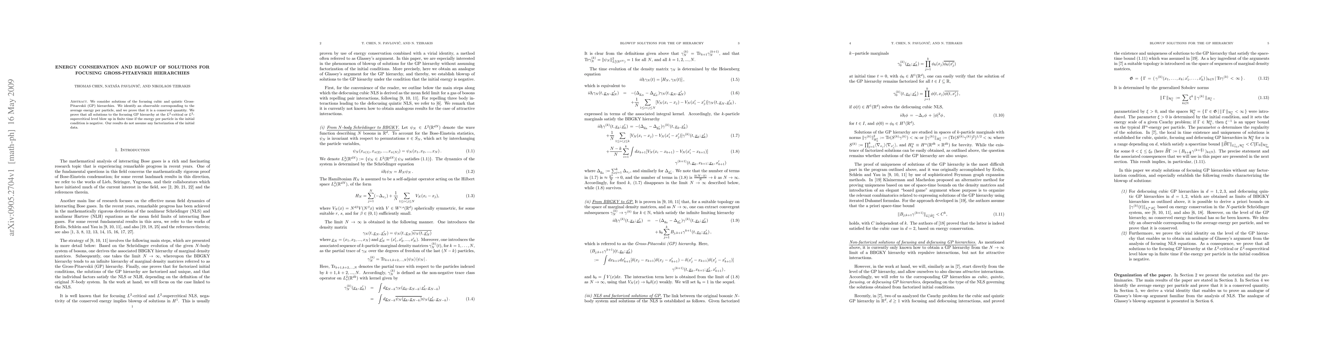 This paper investigates solutions to the focusing cubic and quintic Gross-Pitaevskii hierarchies, proving that the average energy per particle is conserved. It also shows that solutions with negative initial energy per particle will blow up in finite time at $L^2$-critical or $L^2$-supercritical levels.