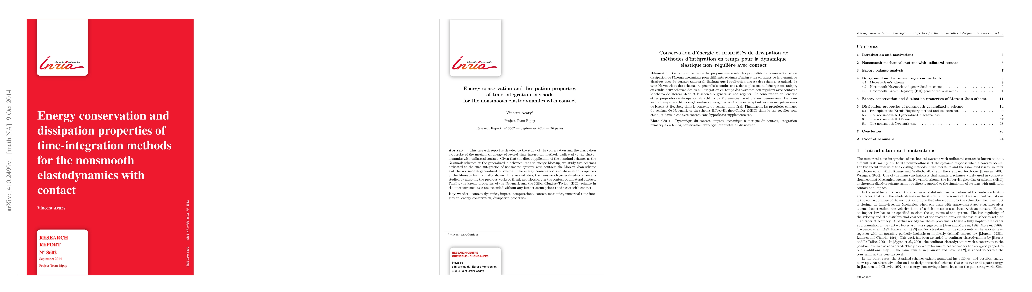 This research report is devoted to the study of the conservation and the dissipation properties of the mechanical energy of several time--integration methods dedicated to the elasto--dynamics with unilateral contact. Given that the direct application of the standard schemes as the Newmark schemes or the generalized--$\alpha$ schemes leads to energy blow-up, we study two schemes dedicated to the time--integration of nonsmooth systems with contact: the Moreau--Jean scheme and the nonsmooth generalized--$\alpha$ scheme. The energy conservation and dissipation properties of the Moreau--Jean is firstly shown. In a second step, the nonsmooth generalized--$\alpha$ scheme is studied by adapting the previous works of Krenk and H{\o}gsberg in the context of unilateral contact. Finally, the known properties of the Newmark and the Hilber--Hughes--Taylor (HHT) scheme in the unconstrained case are extended without any further assumptions to the case with contact.