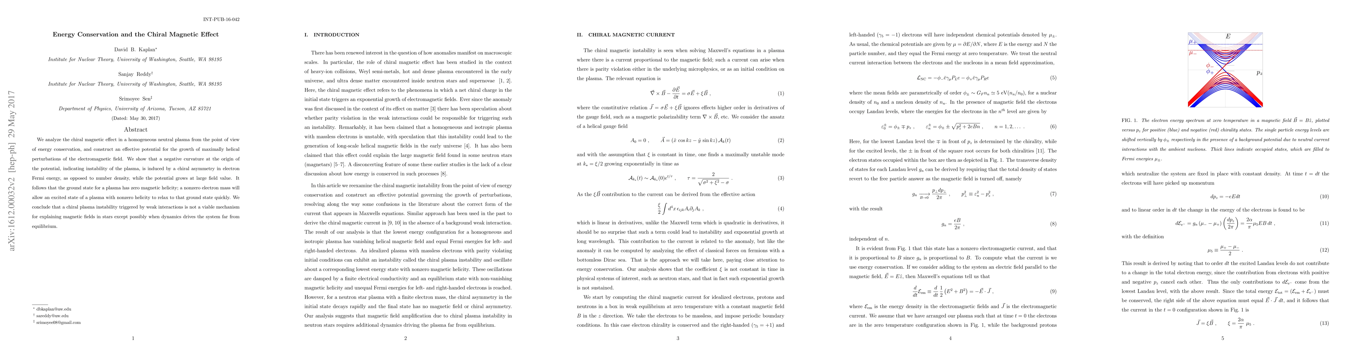 We analyze the chiral magnetic effect in a homogeneous neutral plasma from the point of view of energy conservation, and construct an effective potential for the growth of maximally helical perturbations of the electromagnetic field. We show that a negative curvature at the origin of the potential, indicating instability of the plasma, is induced by a chiral asymmetry in electron Fermi energy, as opposed to number density, while the potential grows at large field value. It follows that the ground state for a plasma has zero magnetic helicity; a nonzero electron mass will allow an excited state of a plasma with nonzero helicity to relax to that ground state quickly. We conclude that a chiral plasma instability triggered by weak interactions is not a viable mechanism for explaining magnetic fields in stars except possibly when dynamics drives the system far from equilibrium.