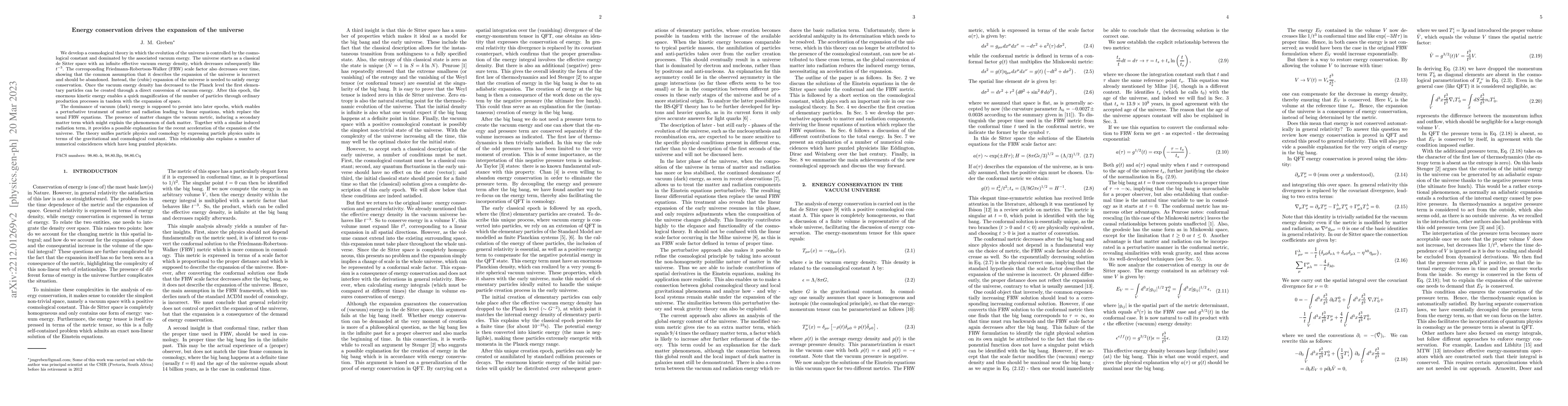This paper proposes a cosmological theory where the universe's expansion is driven by the conservation of energy, with vacuum energy density decreasing over time. It suggests that the traditional FRW scale factor model is incorrect, and instead, the universe's cubic expansion conserves energy, leading to the creation of elementary particles from vacuum energy.