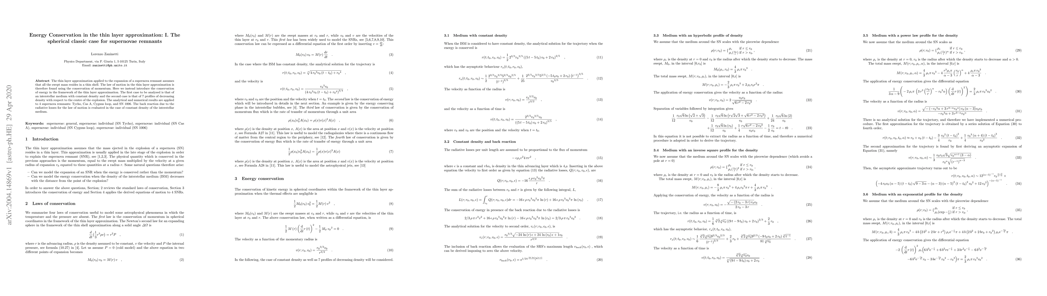 The thin layer approximation applied to the expansion of a supernova remnant assumes that all the swept mass resides in a thin shell. The law of motion in the thin layer approximation is therefore found using the conservation of momentum. Here we instead introduce the conservation of energy in the framework of the thin layer approximation. The first case to be analysed is that of an interstellar medium with constant density and the second case is that of 7 profiles of decreasing density with respect to the centre of the explosion. The analytical and numerical results are applied to 4 supernova remnants: Tycho, Cas A, Cygnus loop, and SN 1006. The back reaction due to the radiative losses for the law of motion is evaluated in the case of constant density of the interstellar medium.