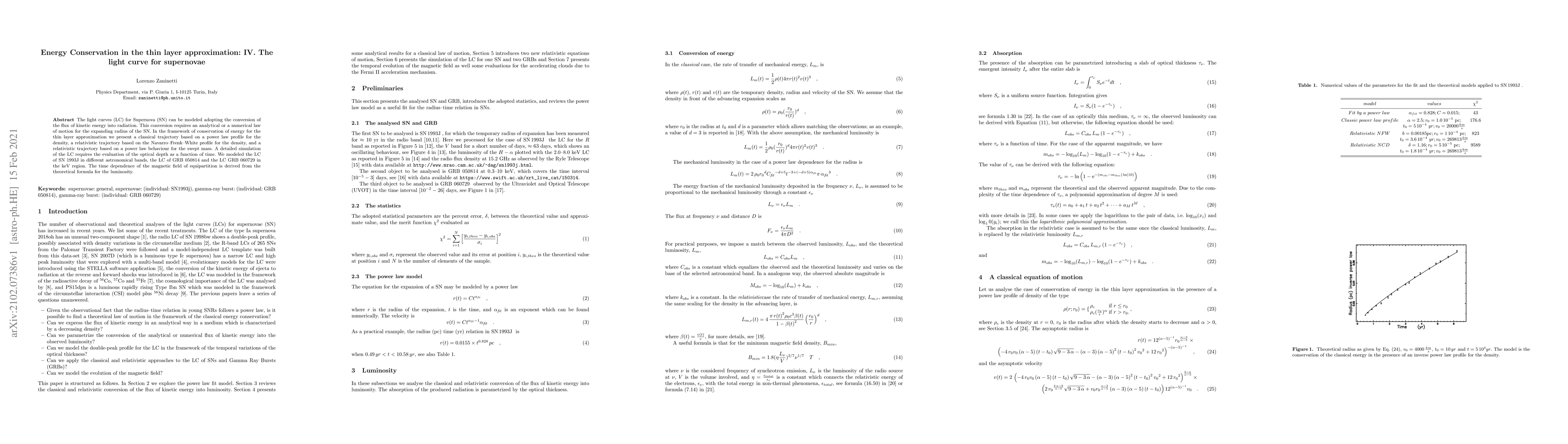 The light curves (LC) for Supernova (SN) can be modeled adopting the conversion of the flux of kinetic energy into radiation. This conversion requires an analytical or a numerical law of motion for the expanding radius of the SN. In the framework of conservation of energy for the thin layer approximation we present a classical trajectory based on a power law profile for the density, a relativistic trajectory based on the Navarro--Frenk--White profile for the density, and a relativistic trajectory based on a power law behaviour for the swept mass. A detailed simulation of the LC requires the evaluation of the optical depth as a function of time. We modeled the LC of SN~1993J in different astronomical bands, the LC of GRB 050814 and the LC GRB 060729 in the keV region. The time dependence of the magnetic field of equipartition is derived from the theoretical formula for the luminosity.