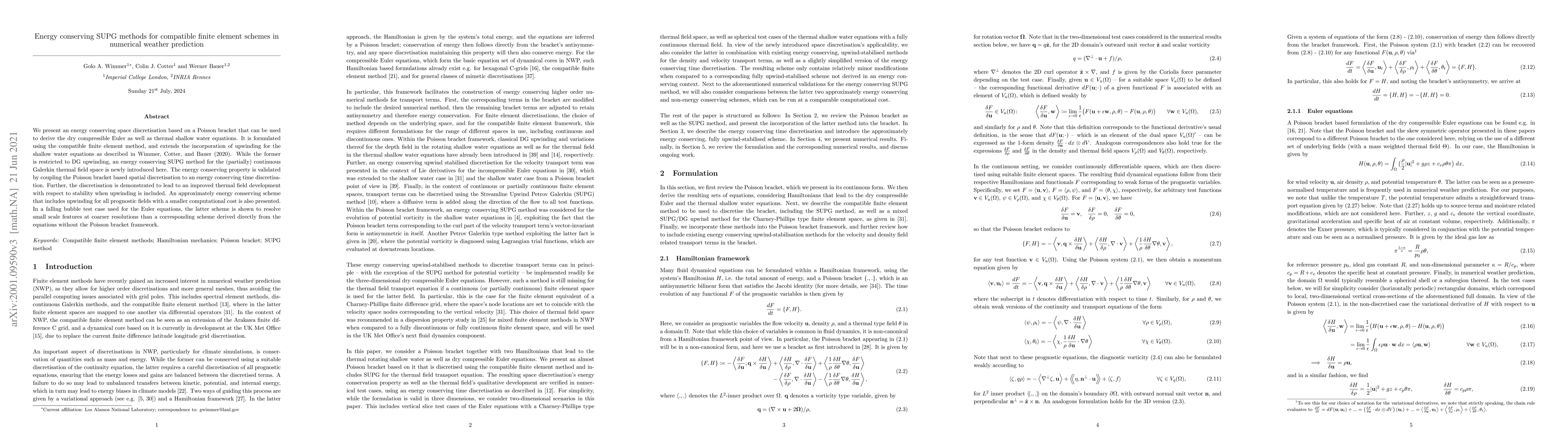 This paper introduces an energy conserving space discretisation based on a Poisson bracket for compatible finite element schemes, extending upwinding methods to SUPG for thermal shallow water equations. The method is validated through coupling with an energy conserving time discretisation and shown to improve stability in temperature field development.