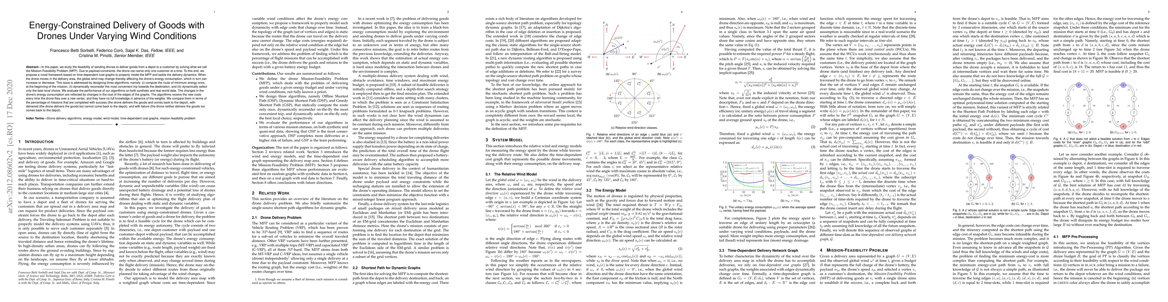In this paper, we study the feasibility of sending drones to deliver goods from a depot to a customer by solving what we call the Mission-Feasibility Problem (MFP). Due to payload constraints, the drone can serve only one customer at a time. To this end, we propose a novel framework based on time-dependent cost graphs to properly model the MFP and tackle the delivery dynamics. When the drone moves in the delivery area, the global wind may change thereby affecting the drone's energy consumption, which in turn can increase or decrease. This issue is addressed by designing three algorithms, namely: (i) compute the route of minimum energy once, at the beginning of the mission, (ii) dynamically reconsider the most convenient trip towards the destination, and (iii) dynamically select only the best local choice. We evaluate the performance of our algorithms on both synthetic and real-world data. The changes in the drone's energy consumption are reflected by changes in the cost of the edges of the graphs. The algorithms receive the new costs every time the drone flies over a new vertex, and they have no full knowledge in advance of the weights. We compare them in terms of the percentage of missions that are completed with success (the drone delivers the goods and comes back to the depot), with delivered (the drone delivers the goods but cannot come back to the depot), and with failure (the drone neither delivers the goods nor comes back to the depot).