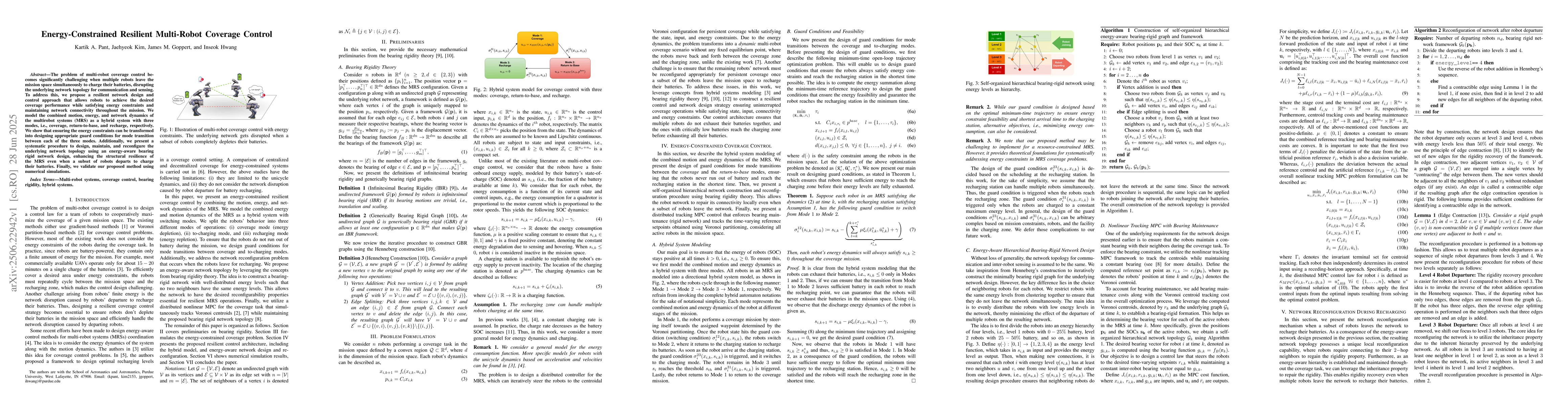 The problem of multi-robot coverage control becomes significantly challenging when multiple robots leave the mission space simultaneously to charge their batteries, disrupting the underlying network topology for communication and sensing. To address this, we propose a resilient network design and control approach that allows robots to achieve the desired coverage performance while satisfying energy constraints and maintaining network connectivity throughout the mission. We model the combined motion, energy, and network dynamics of the multirobot systems (MRS) as a hybrid system with three modes, i.e., coverage, return-to-base, and recharge, respectively. We show that ensuring the energy constraints can be transformed into designing appropriate guard conditions for mode transition between each of the three modes. Additionally, we present a systematic procedure to design, maintain, and reconfigure the underlying network topology using an energy-aware bearing rigid network design, enhancing the structural resilience of the MRS even when a subset of robots departs to charge their batteries. Finally, we validate our proposed method using numerical simulations.