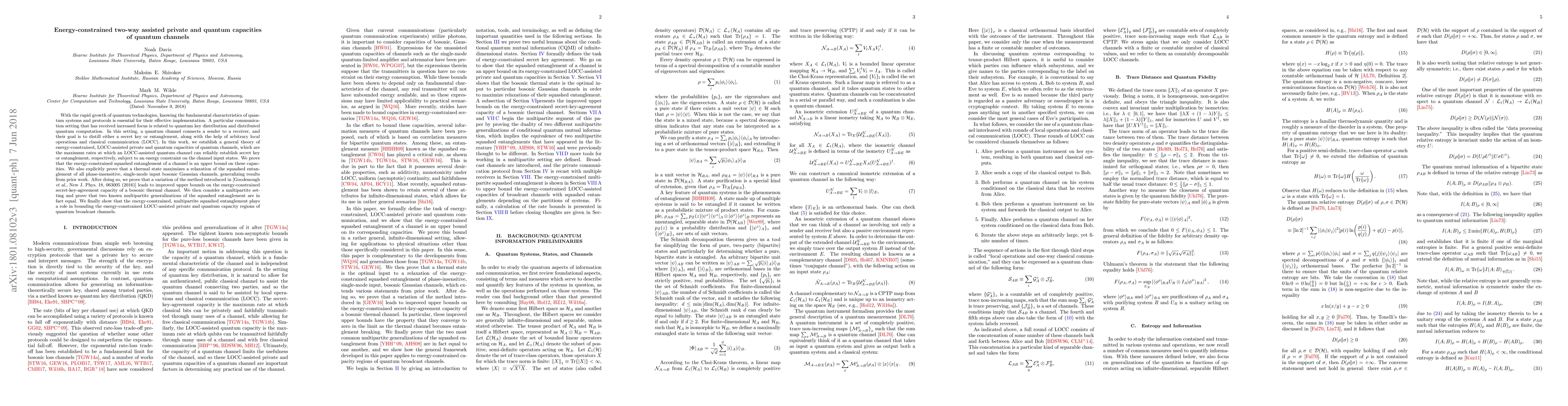 This paper develops a theoretical framework for the energy-constrained, LOCC-assisted private and quantum capacities of quantum channels, establishing the energy-constrained squashed entanglement as an upper bound. It also proves that thermal states maximize a relaxed version of squashed entanglement for Gaussian channels, and improves the upper bounds for secret-key-agreement capacity.