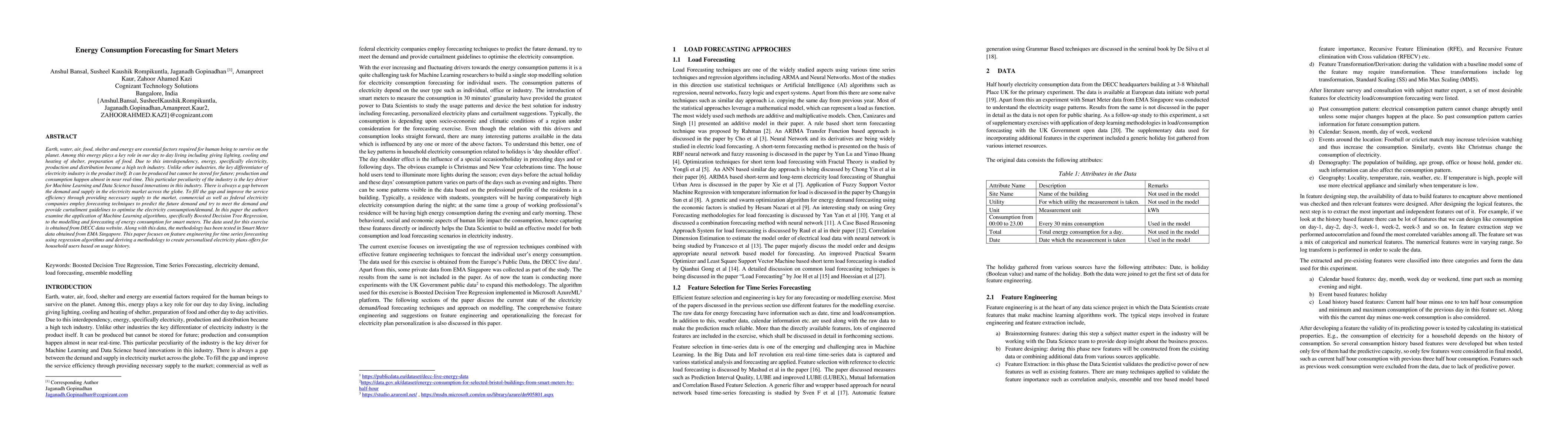 This paper explores the application of Machine Learning, specifically Boosted Decision Tree Regression, for forecasting energy consumption using smart meter data. The authors focus on feature engineering for time series forecasting and propose a methodology to create personalized electricity plans for households based on historical usage.