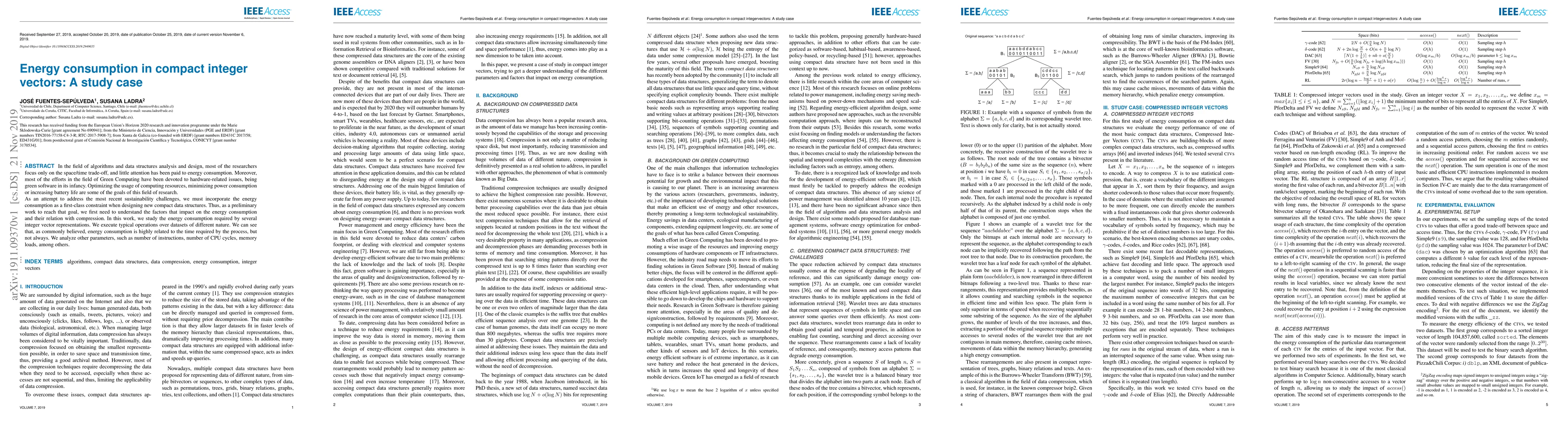 In the field of algorithms and data structures analysis and design, most of the researchers focus only on the space/time trade-off, and little attention has been paid to energy consumption. Moreover, most of the efforts in the field of Green Computing have been devoted to hardware-related issues, being green software in its infancy. Optimizing the usage of computing resources, minimizing power consumption or increasing battery life are some of the goals of this field of research. As an attempt to address the most recent sustainability challenges, we must incorporate the energy consumption as a first-class constraint when designing new compact data structures. Thus, as a preliminary work to reach that goal, we first need to understand the factors that impact on the energy consumption and their relation with compression. In this work, we study the energy consumption required by several integer vector representations. We execute typical operations over datasets of different nature. We can see that, as commonly believed, energy consumption is highly related to the time required by the process, but not always. We analyze other parameters, such as number of instructions, number of CPU cycles, memory loads, among others.