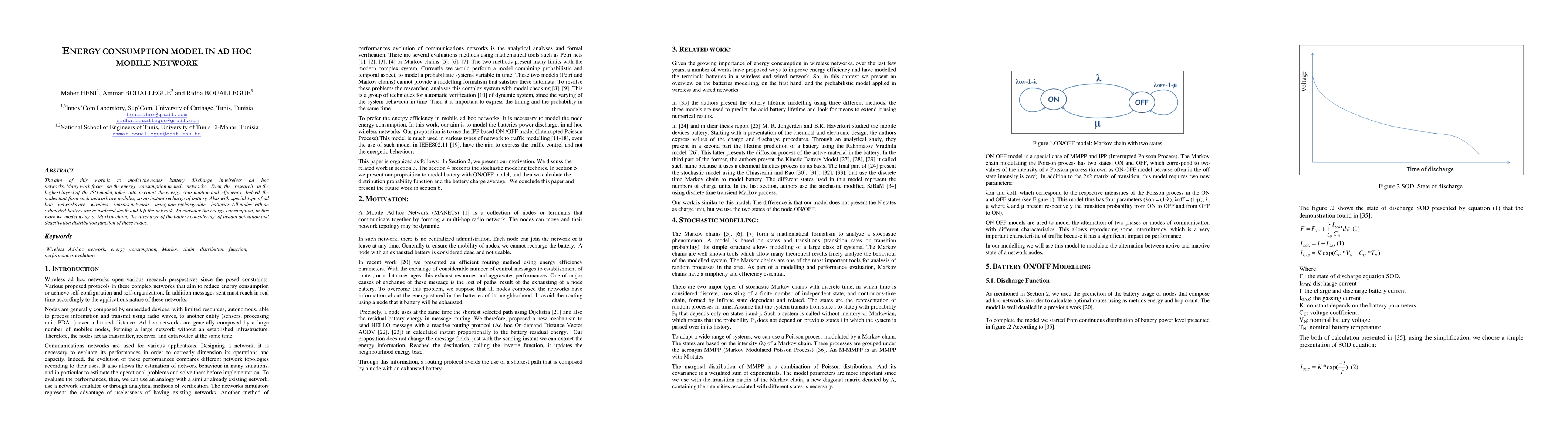 This research paper develops a model to predict battery discharge in ad hoc mobile networks, considering node mobility and non-rechargeable batteries. It uses a Markov chain approach to estimate energy consumption and identifies key factors influencing network lifetime.