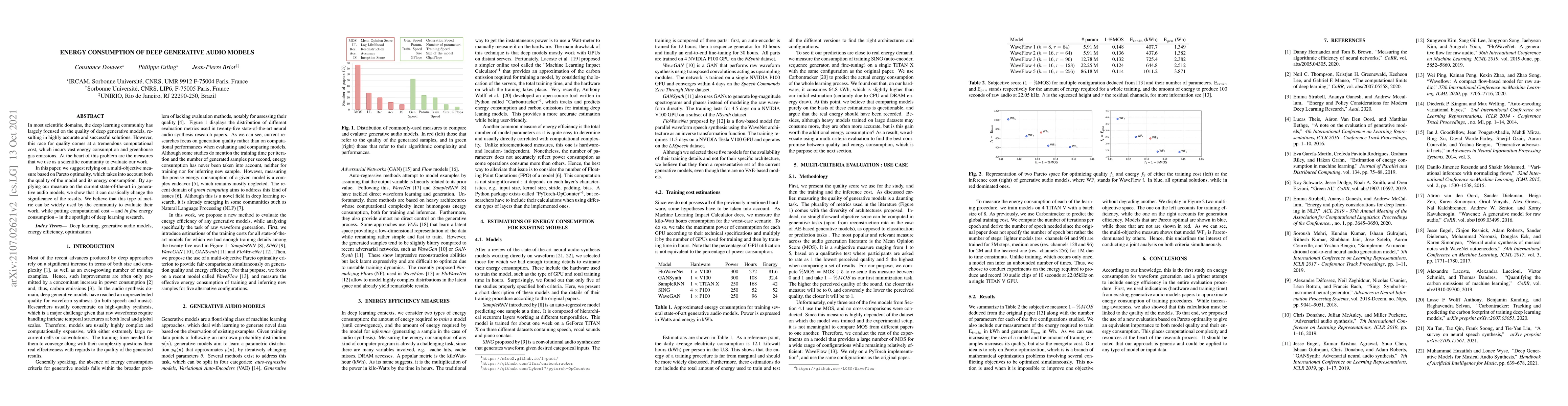In most scientific domains, the deep learning community has largely focused on the quality of deep generative models, resulting in highly accurate and successful solutions. However, this race for quality comes at a tremendous computational cost, which incurs vast energy consumption and greenhouse gas emissions. At the heart of this problem are the measures that we use as a scientific community to evaluate our work. In this paper, we suggest relying on a multi-objective measure based on Pareto optimality, which takes into account both the quality of the model and its energy consumption. By applying our measure on the current state-of-the-art in generative audio models, we show that it can drastically change the significance of the results. We believe that this type of metric can be widely used by the community to evaluate their work, while putting computational cost -- and in fine energy consumption -- in the spotlight of deep learning research.