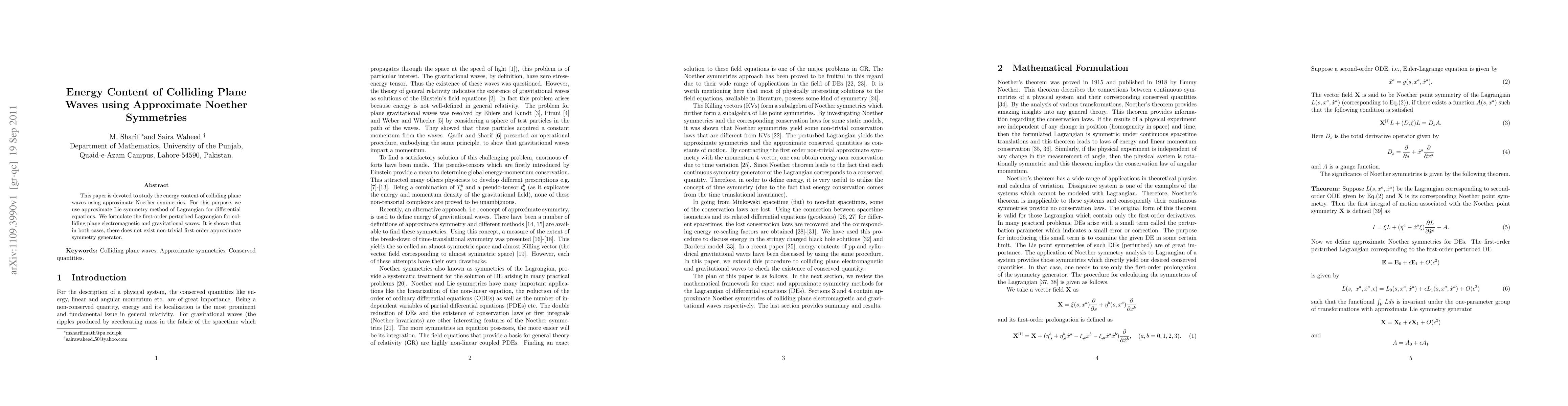 Summary: This paper explores the energy content of colliding plane waves via approximate Noether symmetries and the approximate Lie symmetry method for Lagrangians. It finds no existing symmetries for first-order perturbed Lagrangians in colliding electromagnetic and gravitational waves.