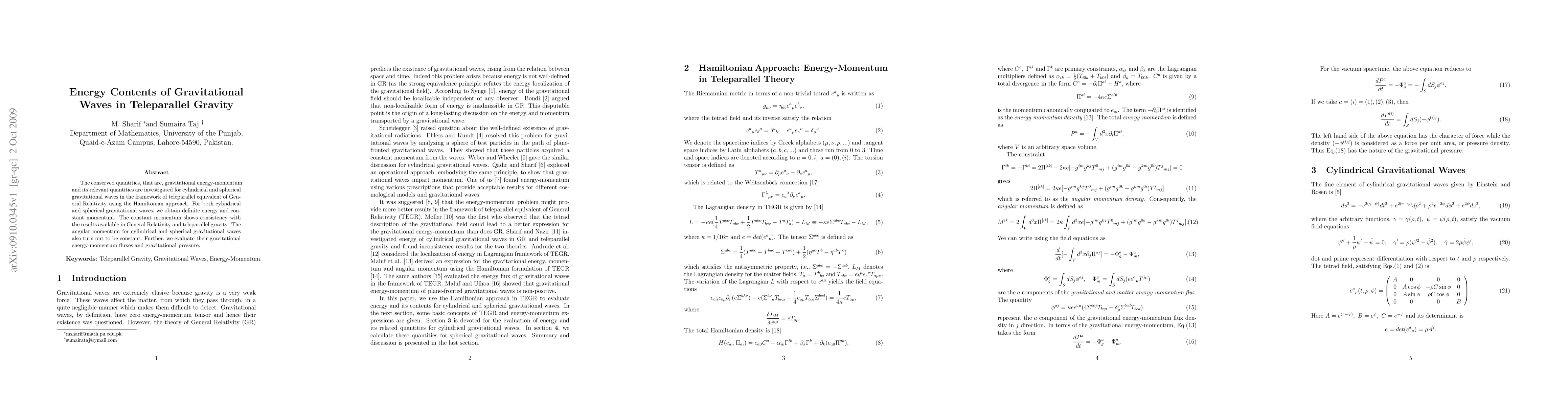This paper investigates gravitational energy-momentum and related quantities for cylindrical and spherical gravitational waves in teleparallel gravity, finding constant energy and momentum, consistent with General Relativity and teleparallel gravity results, and evaluating gravitational energy-momentum fluxes and pressure.