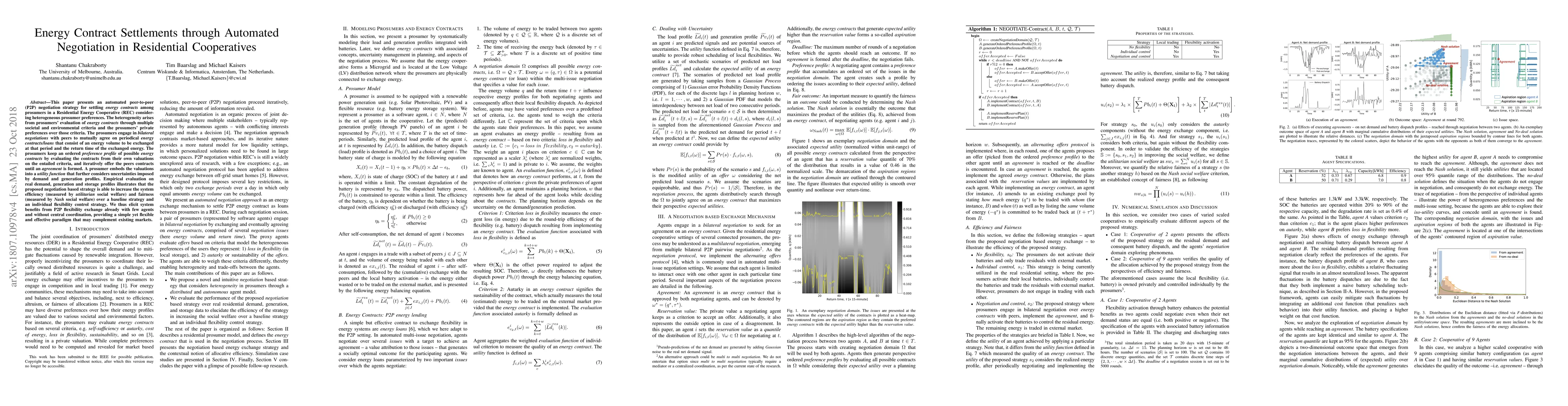 This paper proposes an automated negotiation strategy for settling energy contracts among prosumers in residential cooperatives, enhancing system efficiency and fairness through peer-to-peer bilateral negotiations. Empirical results show improved utilitarian and Nash social welfare compared to baseline strategies.