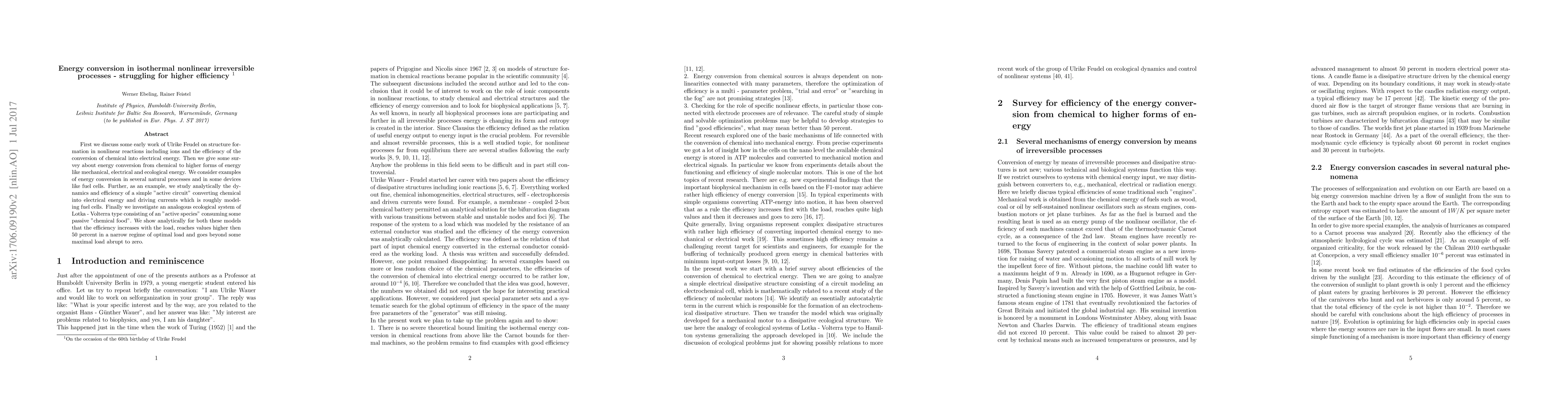 First we discuss some early work of Ulrike Feudel on structure formation in nonlinear reactions including ions and the efficiency of the conversion of chemical into electrical energy. Then we give some survey about energy conversion from chemical to higher forms of energy like mechanical, electrical and ecological energy. We consider examples of energy conversion in several natural processes and in some devices like fuel cells. Further, as an example, we study analytically the dynamics and efficiency of a simple "active circuit" converting chemical into electrical energy and driving currents which is roughly modeling fuel cells. Finally we investigate an analogous ecological system of Lotka - Volterra type consisting of an "active species" consuming some passive "chemical food". We show analytically for both these models that the efficiency increases with the load, reaches values higher then 50 percent in a narrow regime of optimal load and goes beyond some maximal load abrupt to zero.